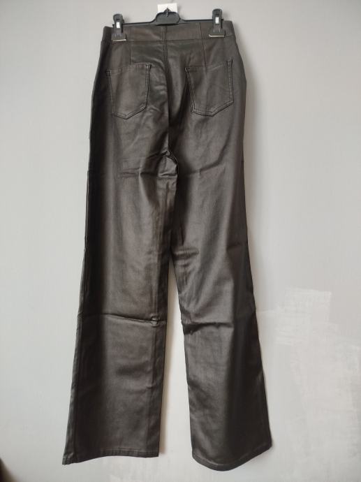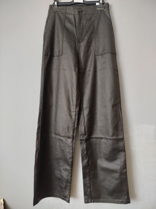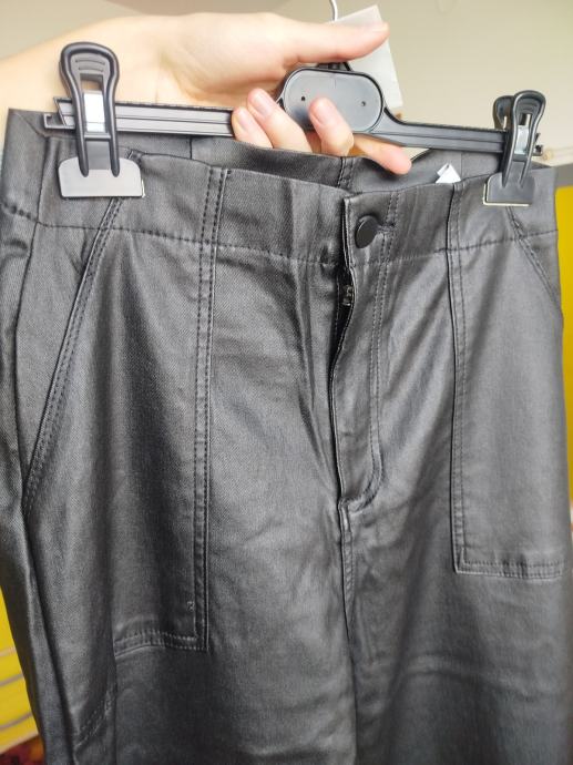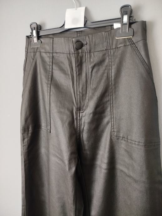 Prodajem crne ženske hlače od umjetne kože, nove s etiketom. Veličina je 36 (W26-W27). Hlače su širokih nogavica, s džepovima sprijeda i straga.