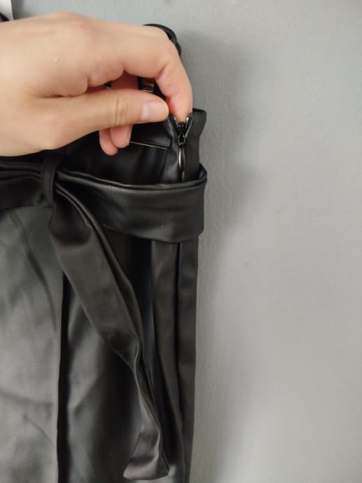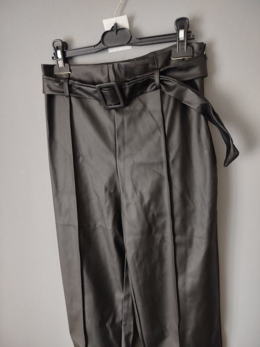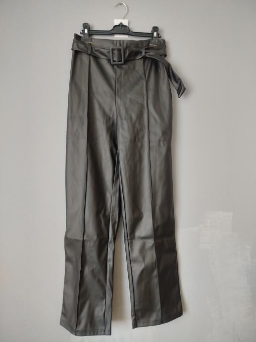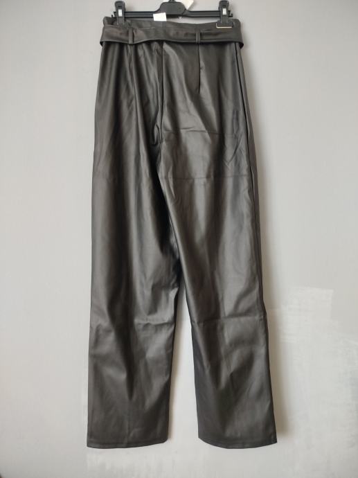Prodajem nove ženske hlače od umjetne kože s etiketom, u crnoj boji. Hlače su visokog struka s remenom koji dolazi u kompletu, a kroj je širih nogavica. Veličina je 38 (W28-W29).
