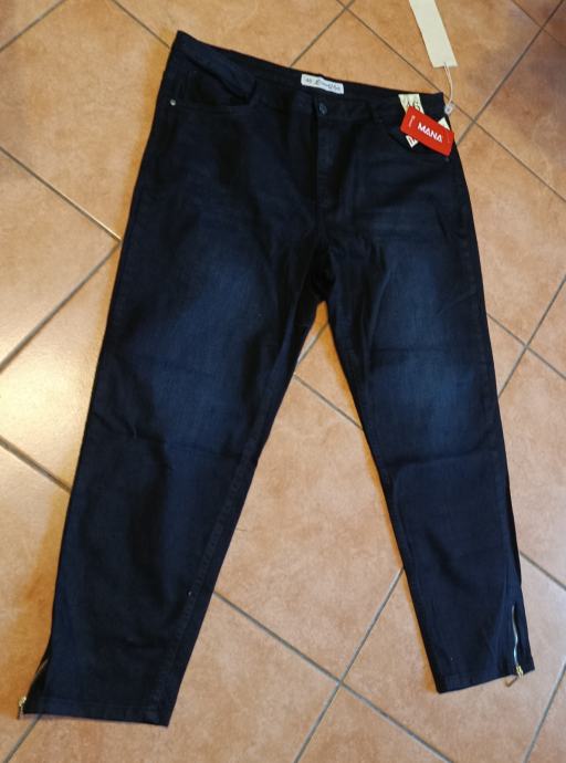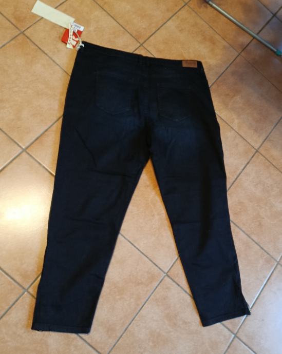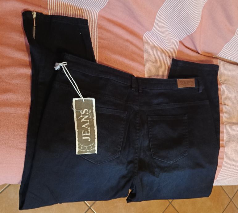 Izrazito tamnoplave boje, cropped (skraćenog) slim kroja. Veličina 46. Imaju karakteristične patentne zatvarače na krajevima nogavica.