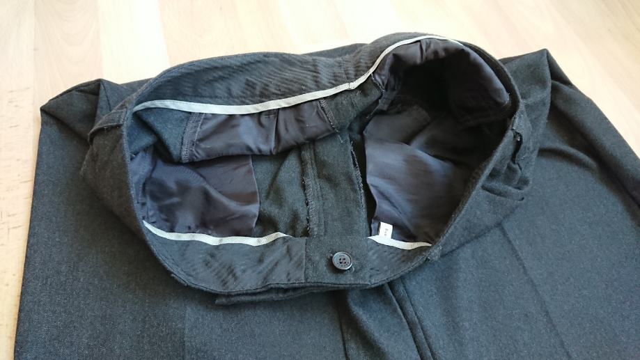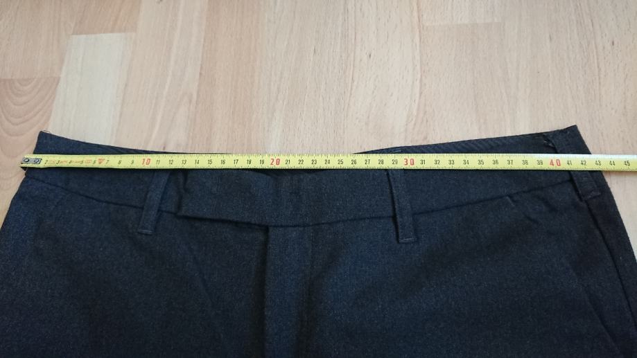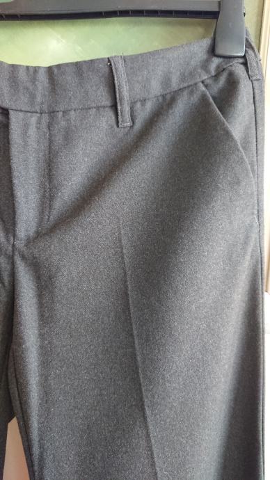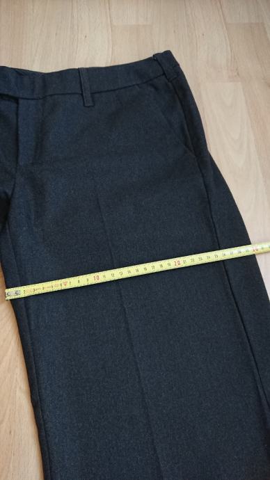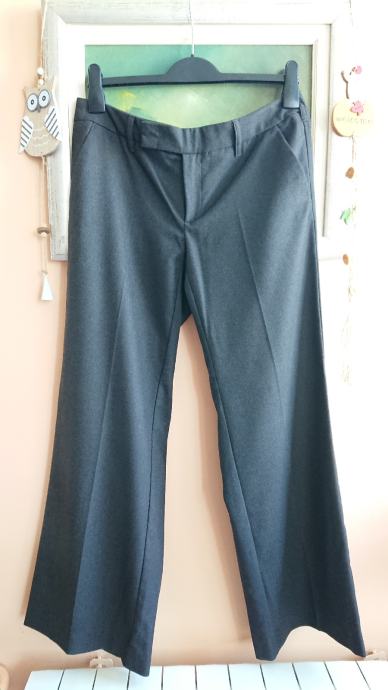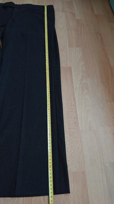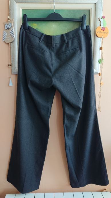 Poslovne hlače za žene, vel. M, kao novo, jednom nošene (etikete su odrezane), tamnosive boje, široke su, nisu slim model, mjere su uslikane (širina u struku, širina nogavice na bedru i dužina hlača). Hlače se kopčaju na cif i gumb, imaju pasice za remen, te dva džepa naprijed i dva džepa otraga.