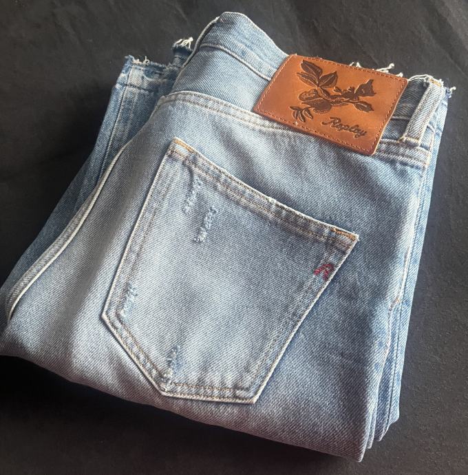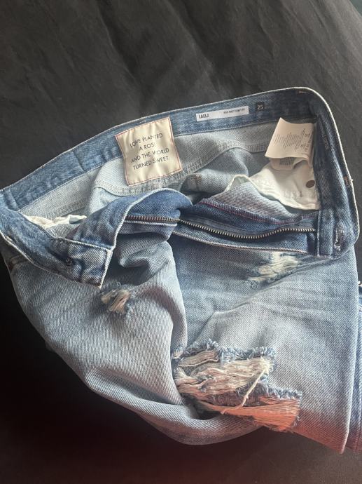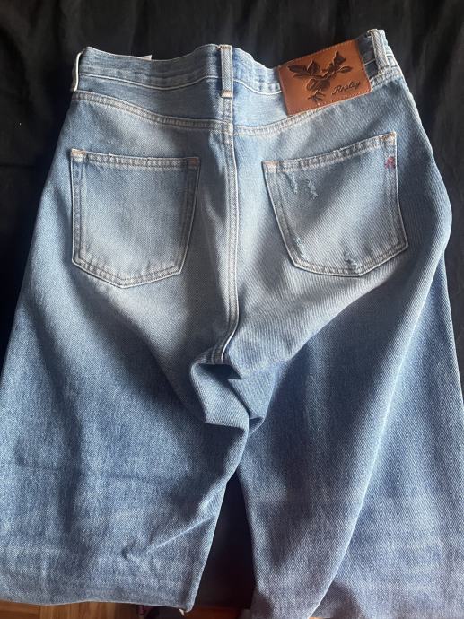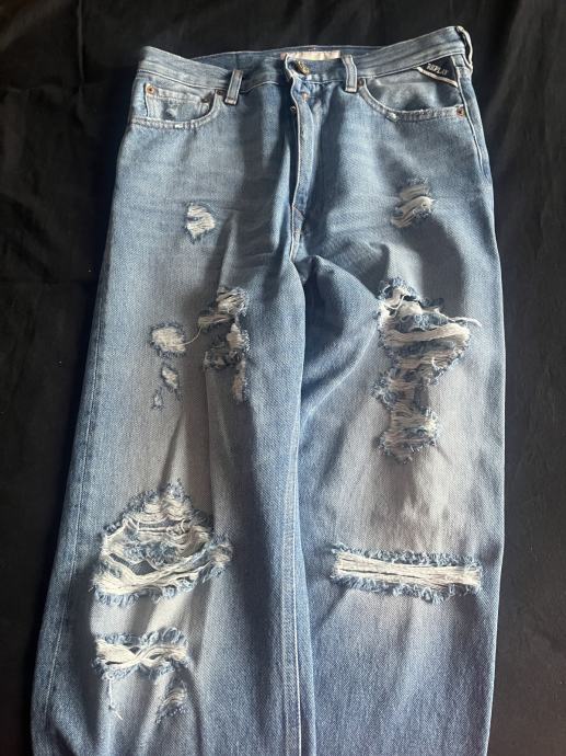 Ženske traperice od pamučnog trapera, svijetle, opuštenog kroja s visokim strukom i ekstra širokim nogavicama, "poderotine" niz nogavice i na rubovima, pet džepova. Dva prednja džepa, džepić za kovanice, dva džepa straga s vezom u obliku slova R, lanac s kamenčićima zakačen na desnoj strani. Replay etiketa u obliku trokuta s prednje lijeve strane, prilagođena kožna etiketa s cvjetnim printom na stražnjoj strani pojasa. Kopčanje na patentni zatvarač i gumb.