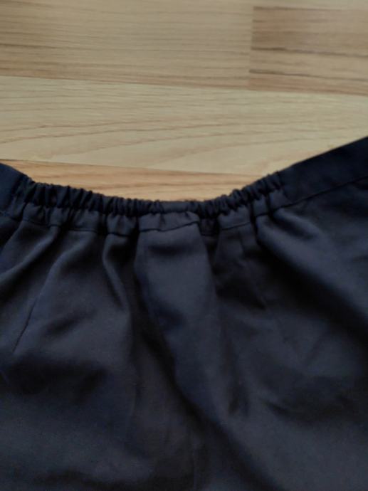 Crne hlače, imaju gumu, nošene kratko, nemaju tragova osim jedva se vidi malo kao konac vani na desnoj nogavici ali straga (priložena slika), zip je sastrane