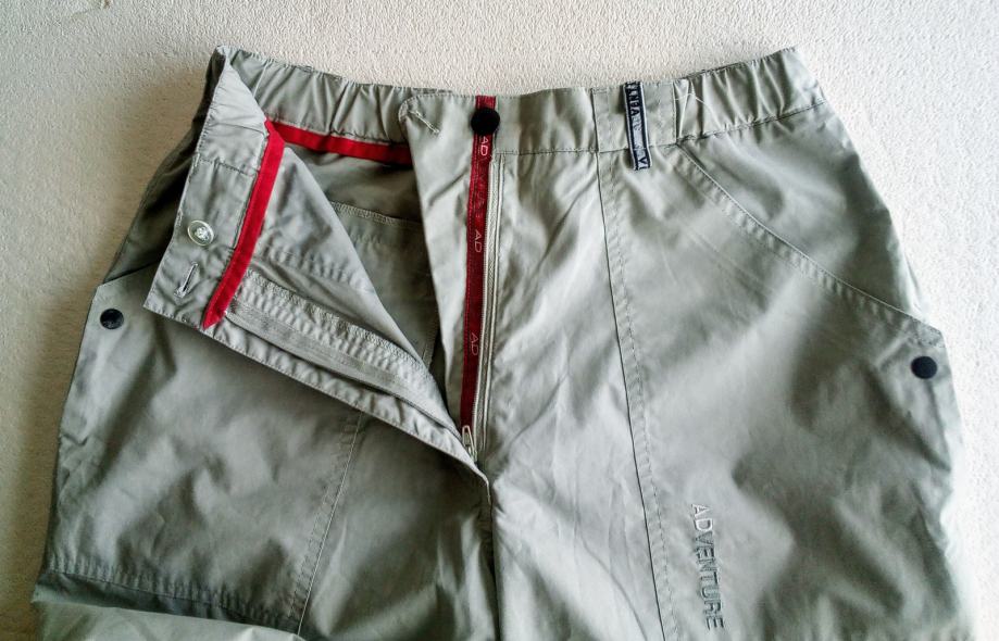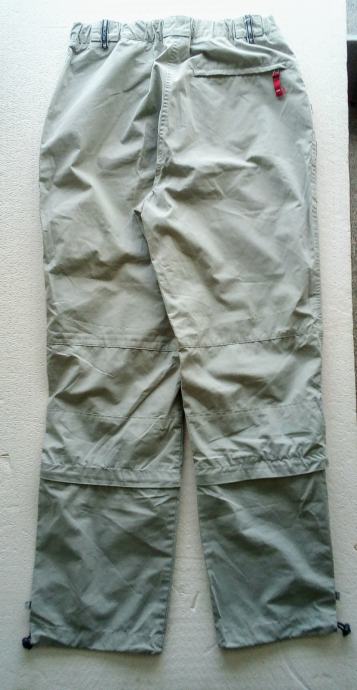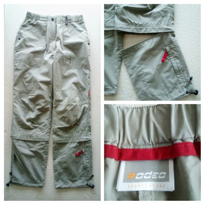SNIŽENO! Sportske hlače RODEO SPORTS BY C&A. Veličina EU 40, svijetle sivo drap boje. Nose se na dva načina : kao duge hlače i nakon skidanja donjeg dijela povezanog zipom postaju 3/4 hlače. Na donjoj duljini mogu se stegnuti ušivenom gumom. Prednji džepovi mogu se otkopčati i proširiti. Na stražnjem džepu je zip. Na lijevoj nogavici pri dnu je skriveni džep. Imaju šlingice za remen (po želji). Materijal je kombinacija poliestera i pamuka.