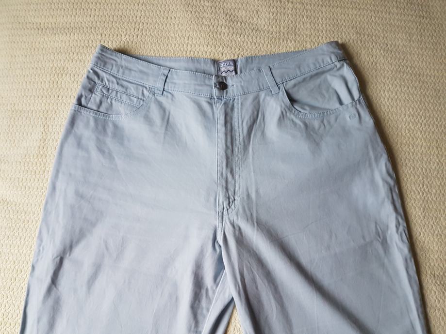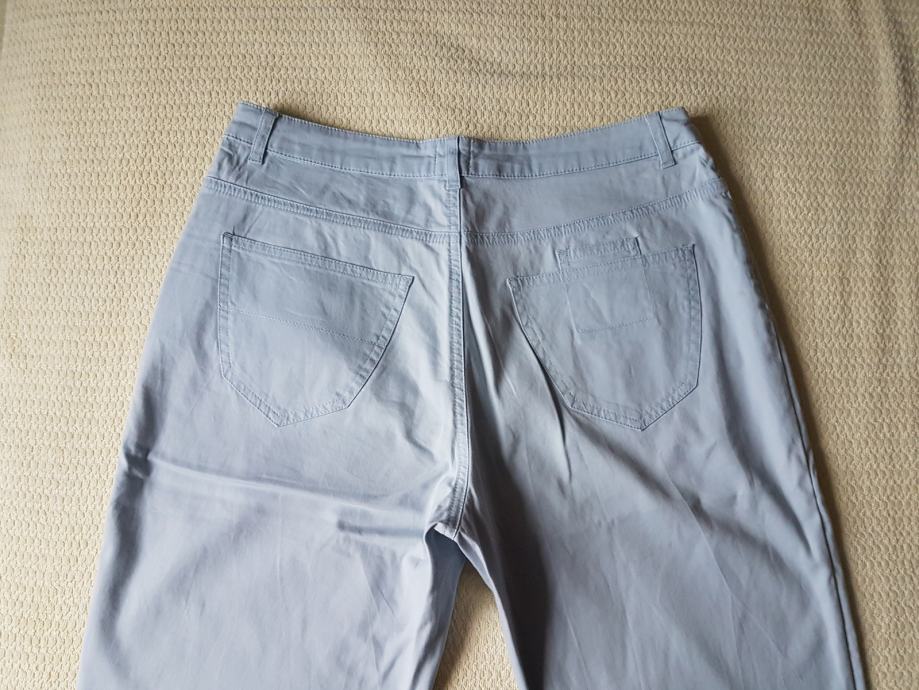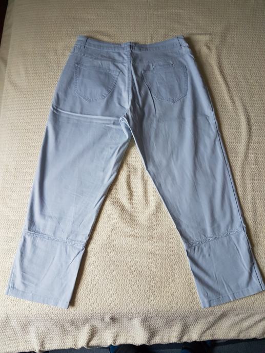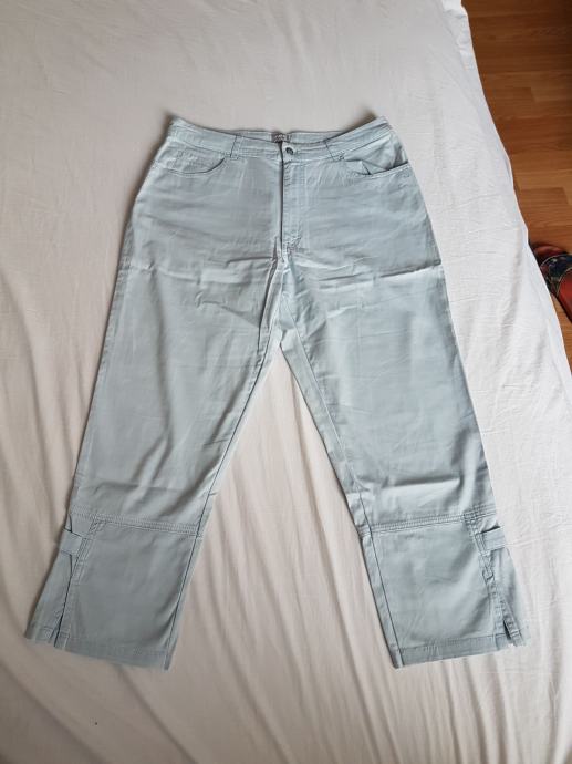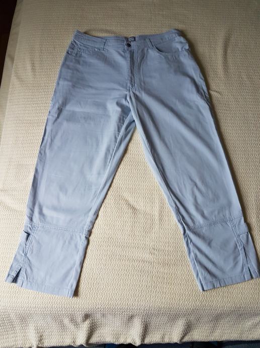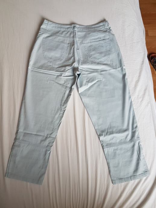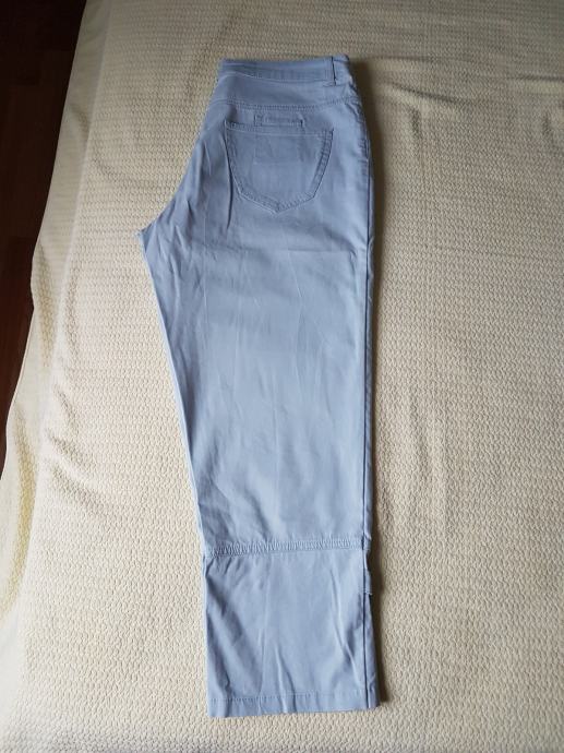 Pamučne svijetloplave hlače, elastične, dužine ispod koljena, tri četvrt (3/4), capri. Malo nošene, očuvane. Na deklaraciji veličina 42, no mislim da su M/L (40), dimenzije: struk: 38-40 cm (rastežu se), bokovi: 49-51cm, dužina: 85cm. Slikano bez i sa blicem.