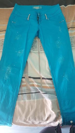 Prodajem svijetloplave hlače s "poparanim" uzorkom na prednjem dijelu. Veličina S, ima par detalja sa šljokicama/perlicama. Potpuno nove!