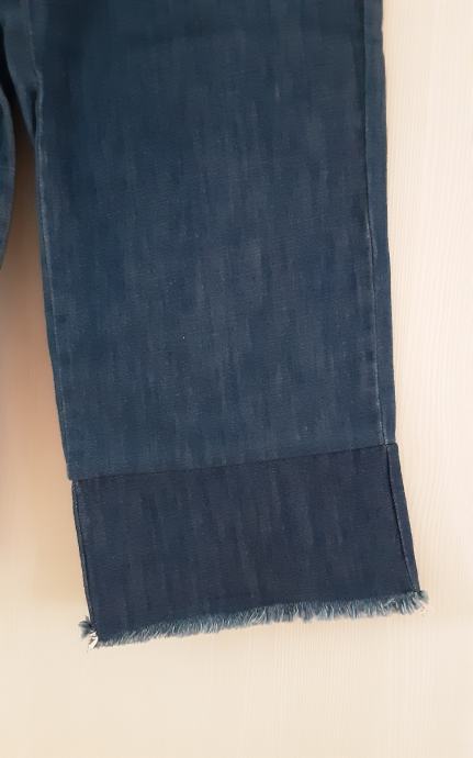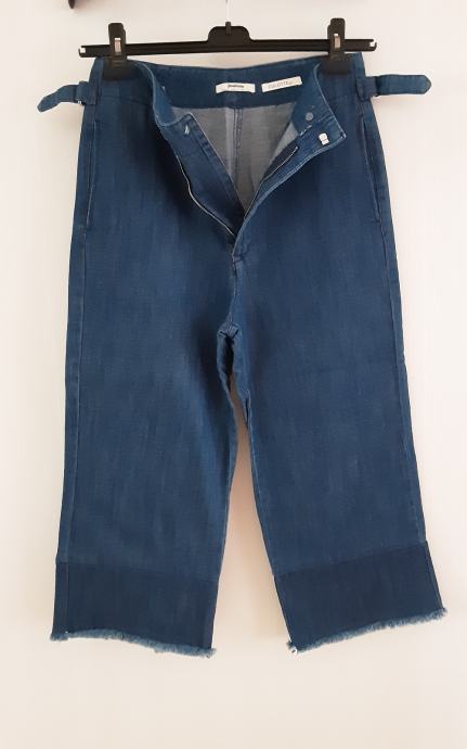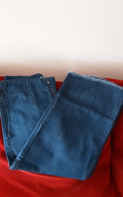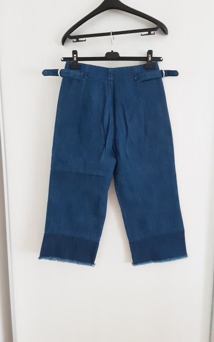 Traperice od cistog pamuka, plave boje, viseg struka sa skrivenim dzepovima, podesivim trakama sa strane i sirim nogavicama duzine 7/8, prava velicina 40. Sirina struka 40 cm, sirina nogavica 28 cm, duzina nogavica 84 cm. Traperice su vrlo udobne, nenosene.