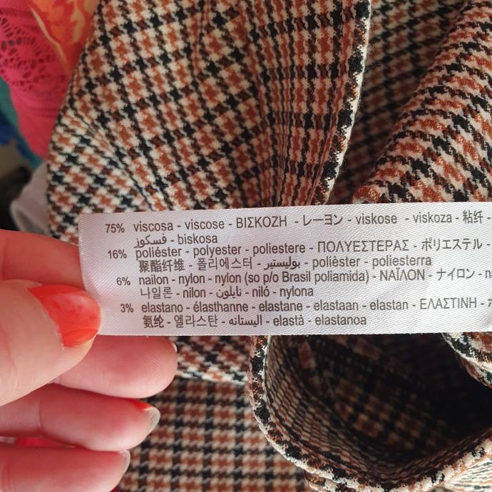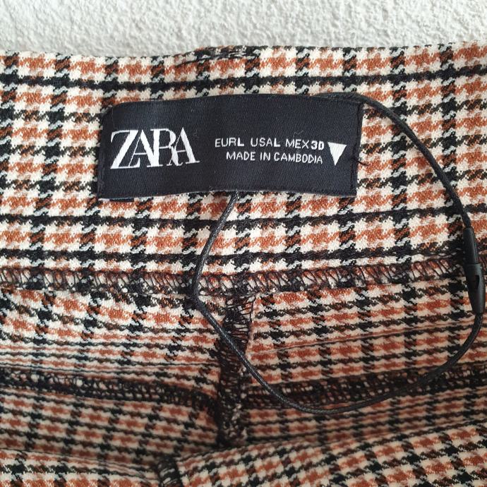 Zara nove hlače sa uzorkom L, odgovara M. Mjere su struk 37 cm, bokovi 43 cm, dužina 99 cm, dužina iznutra 70 cm. Sastav je 75 %viskoza 16 % poliester, 6 % najlon, 3 % elastin. Etiketu sam skinula, ali špaga je još na njima.