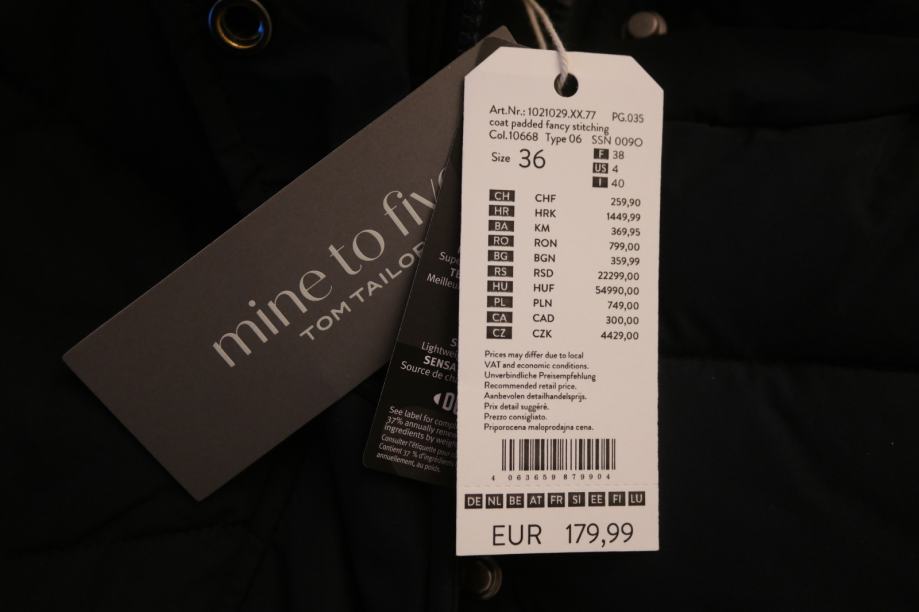 Topli zimski kaput, Tom Tailor, finija i skuplja linija Mine to Five, veličina 36, komotniji model, nov s etiketom