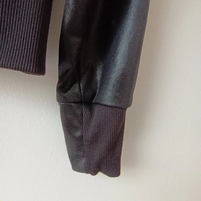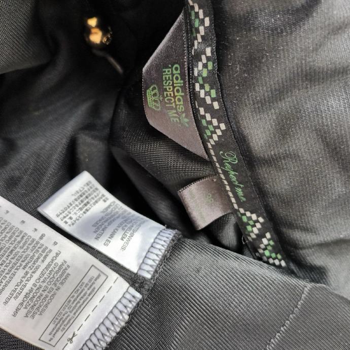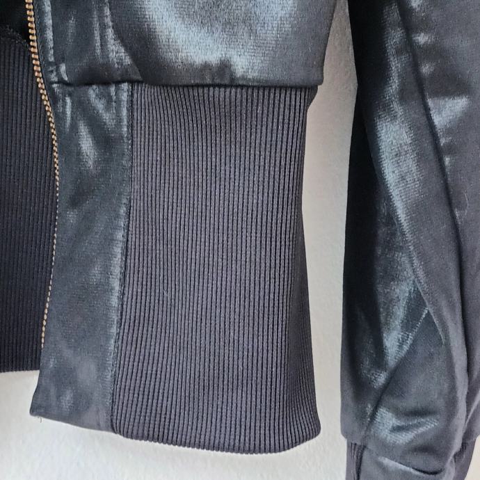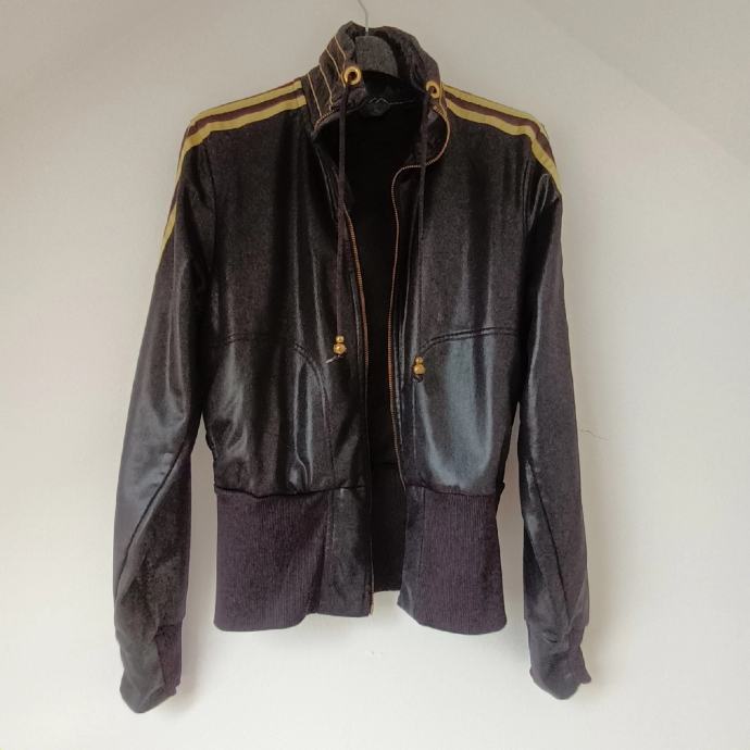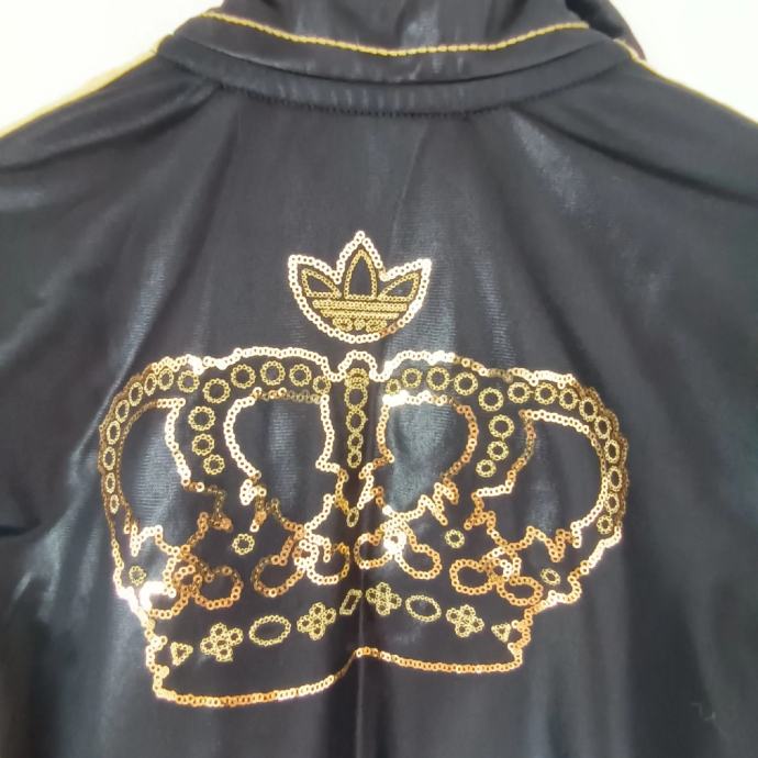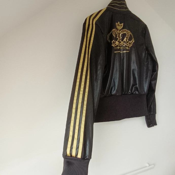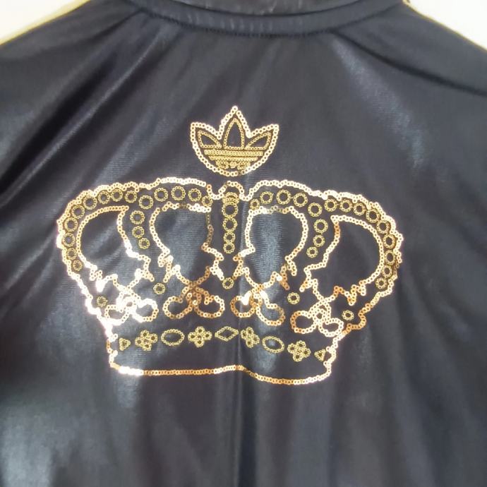 Adidas originals crna jakna 38 sa zlatnim detaljima kao npr krunama na vezicama a materijal je crni i sjajni poput mokre kože, iznimna i posebna u stanju kao iz trgovine uz jednu manu a to je da mi je negdje ispao patent zatvarač i ne smeta jer sam ju ionako voljela nositi otvorenu