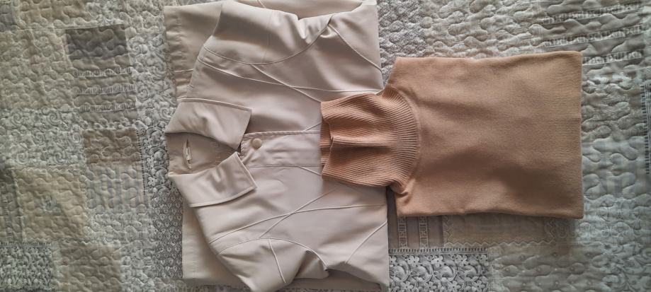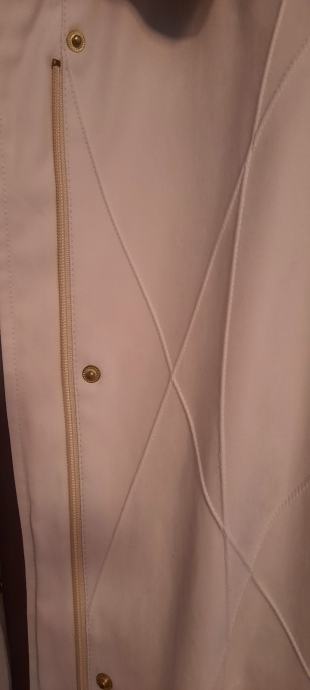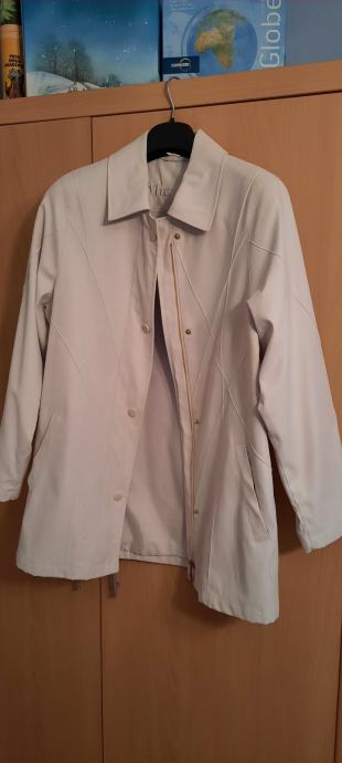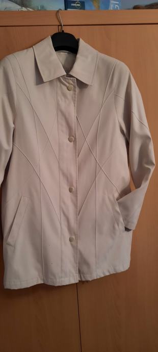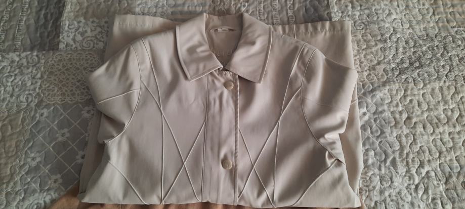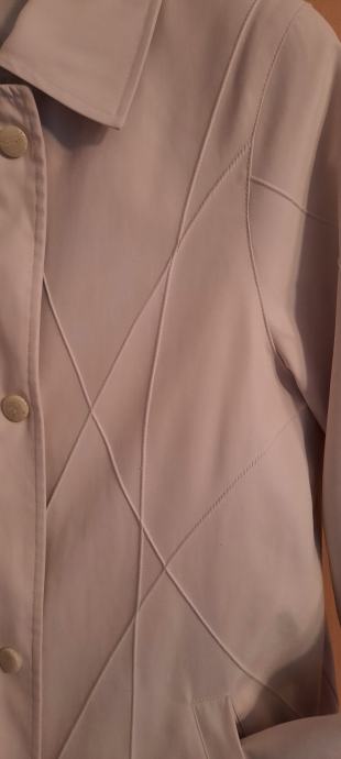 Nova lijepa jaknica dobivena iz inozemstva. Njemačka veličina 38 koja odgovara našem 40 ( L) , GB 12. Svjetlo bež boje. Materijal je kao kod balonera...neka mješavina, nije pamuk. Vrlo se lako održava. Kvalitetna, lijepog dizajna sa zanimljivim proštepima. U ramenima je 41 cm, u prsima 53 cm, rukav je 61 cm, a duljina 80 cm.