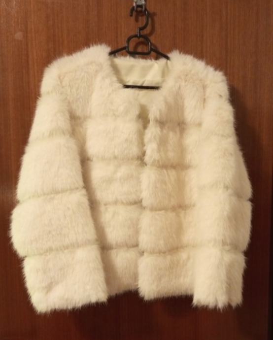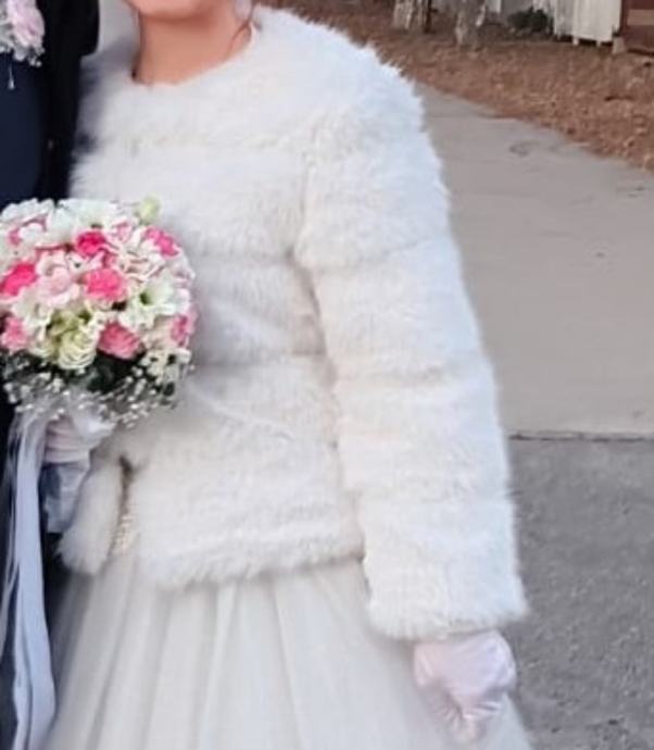 Bijela kratka bunda bez ovratnika s džepovima, nošena na dan vjenčanja u prosincu.