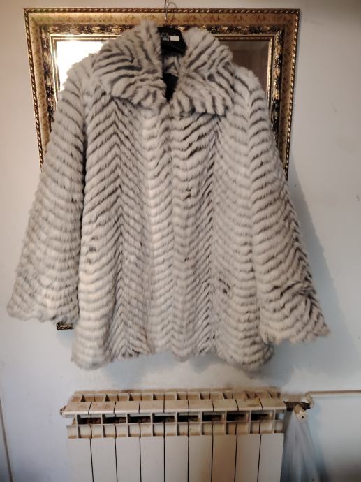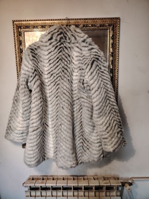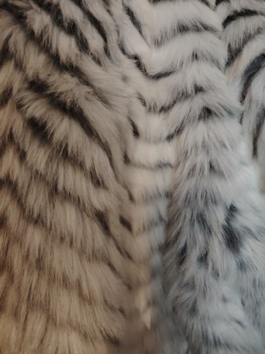 Nova bijela bunda od umjetnog krzna koja izgleda kao pravo krzno, veličine 42 (odgovara L do XL). Bunda je elegantnog dizajna s prugastim uzorkom i nikada nije nošena, samo je uklonjena etiketa.