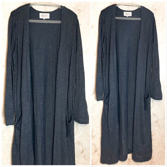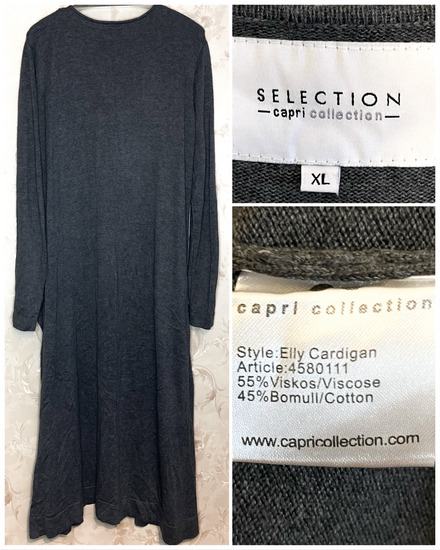 Siva boja, dugacak, dzepovi, bez kopcanja i vezanja.