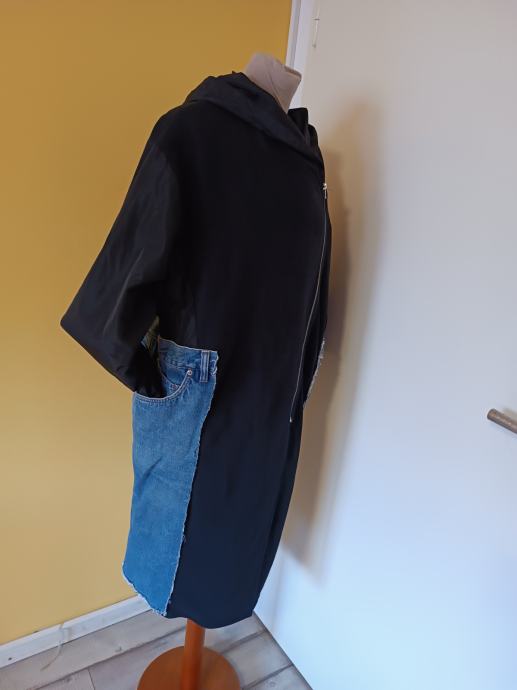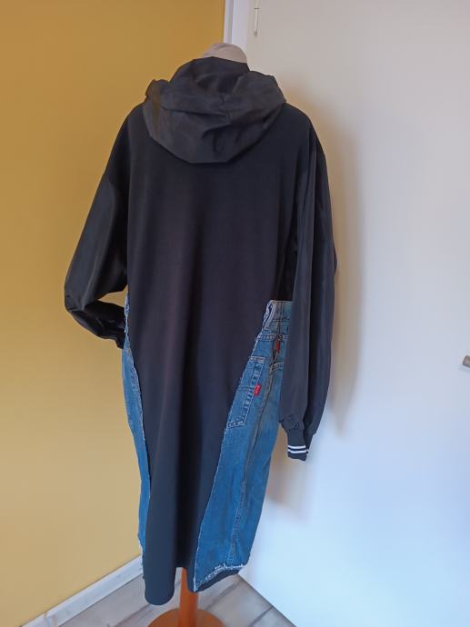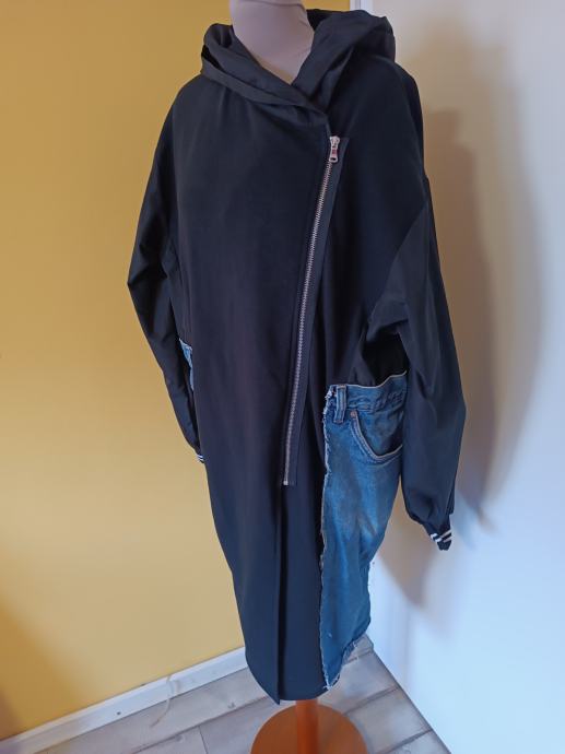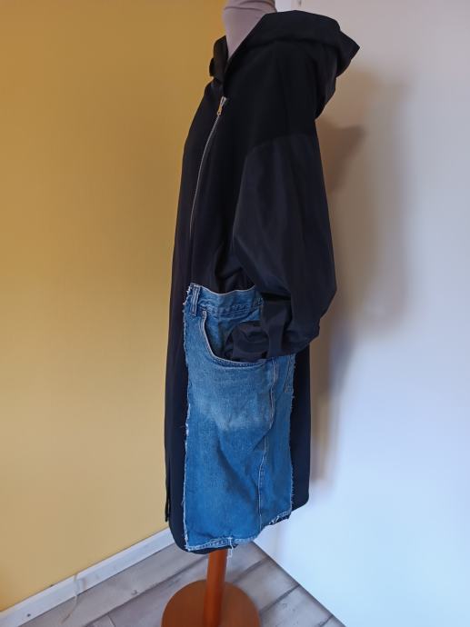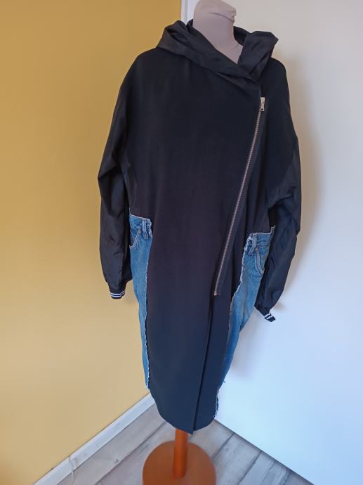 Dugačka crna jakna s traper dodatkom. Istaknut dijagonalni patent zatvarač. Našiveni traper detalji na džepovima i rukavima.