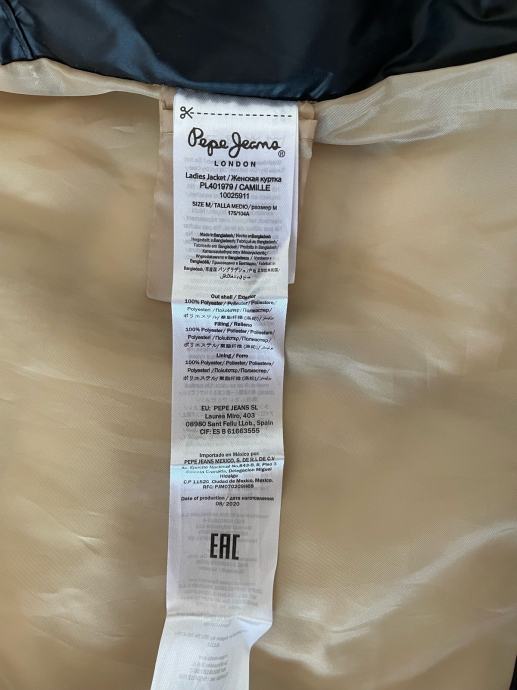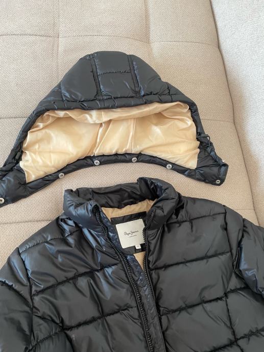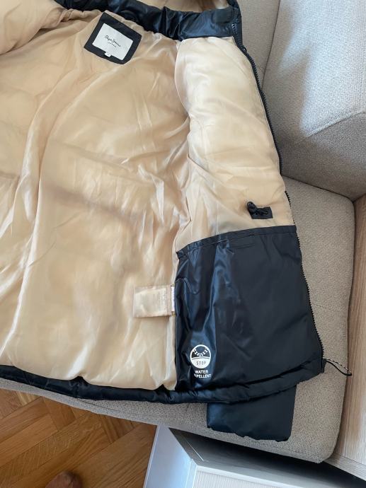 Crna, debela ( topla) zimska jakna M velicine PEPE JEANS LDN, nova, nenošena, sa žutim futerom i kapuljacom koja se skida povoljno, zbog krive veličine