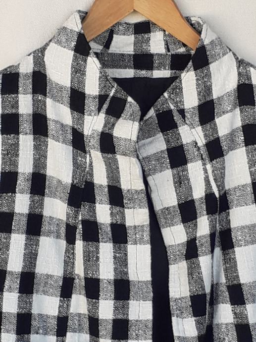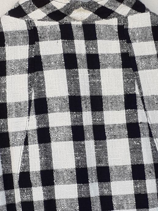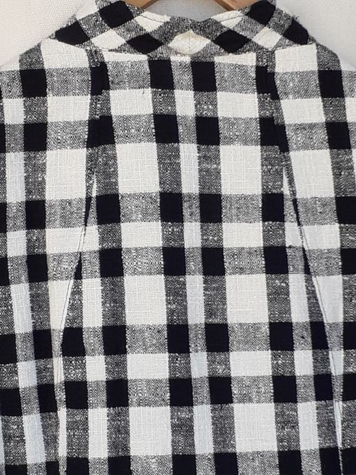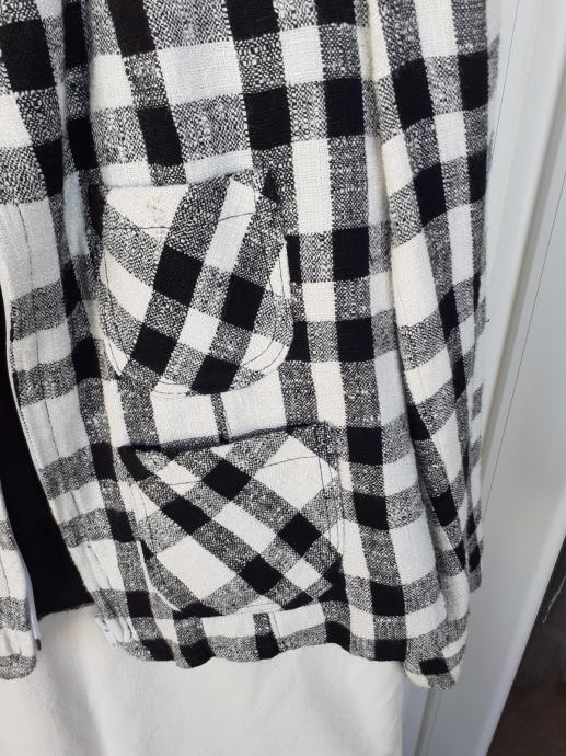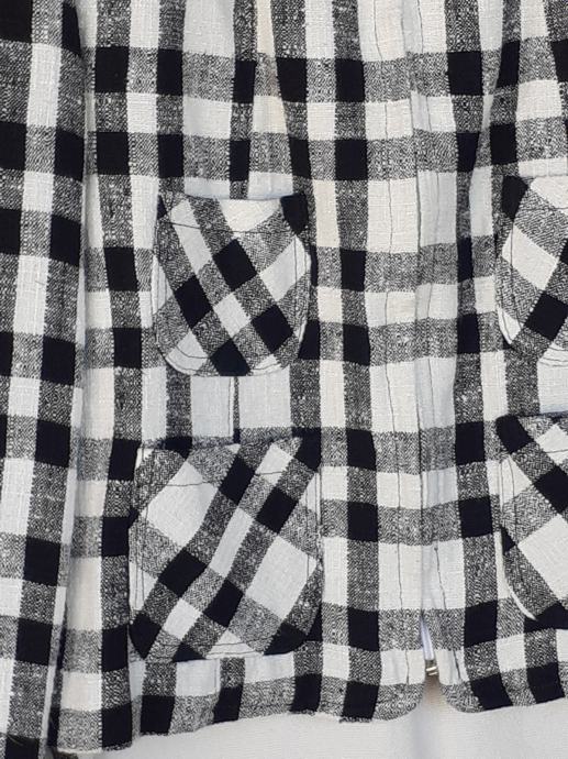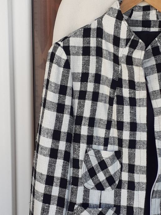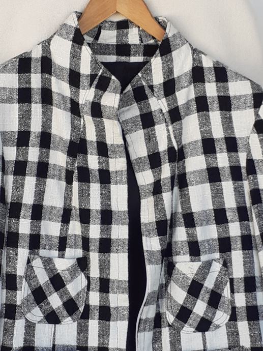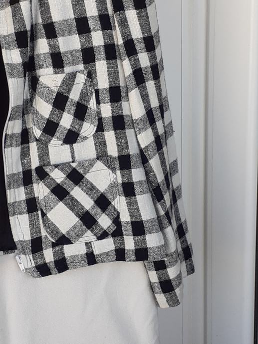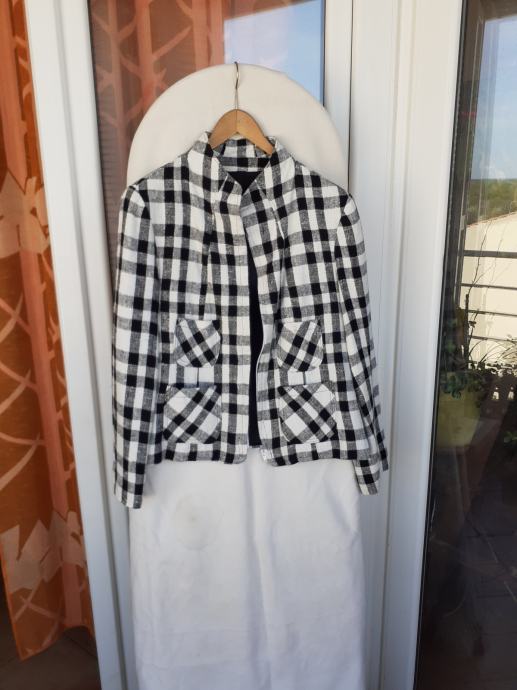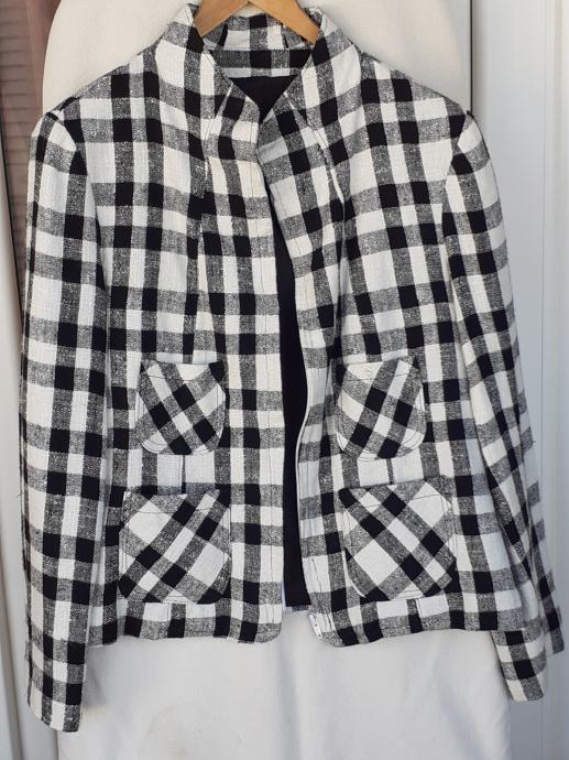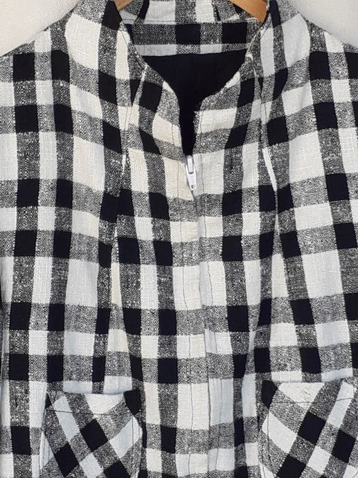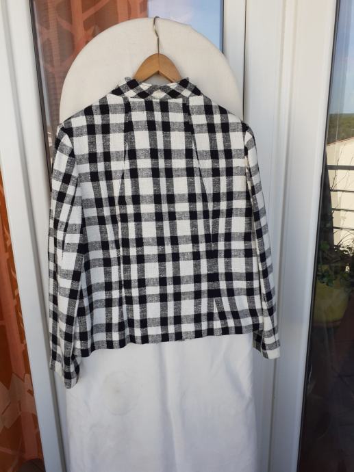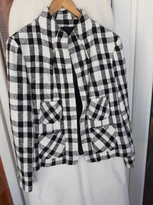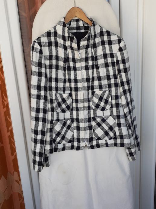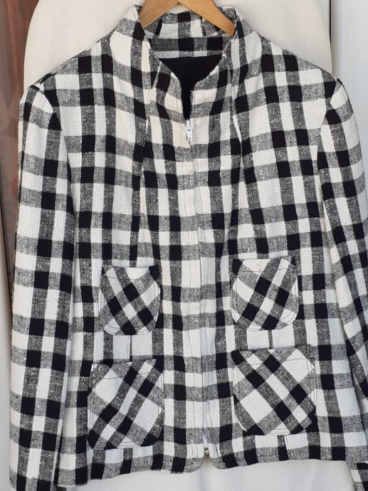 Vrlo ugodan, lagan, prozračan, podstavljen, od lanenog materijala, namijenjen za toplije proljetno ili jesensko vrijeme, kao nov, bez greške. Kopčanje patentom, visoki ovratnik, dva manja i dva veća džepića. Moj rad po mjerama za mene, pomoću njemačkog časopisa Burda, koji ima vrlo precizne krojeve i mjere, a savršeno odgovaraju našim mjerama-njemačka preciznost. Širina od pazuha do pazuha 55, dužina od vratnog izreza iza do ruba 57, širina ramena 45, dužina rukava od pazuha do ruba 44.