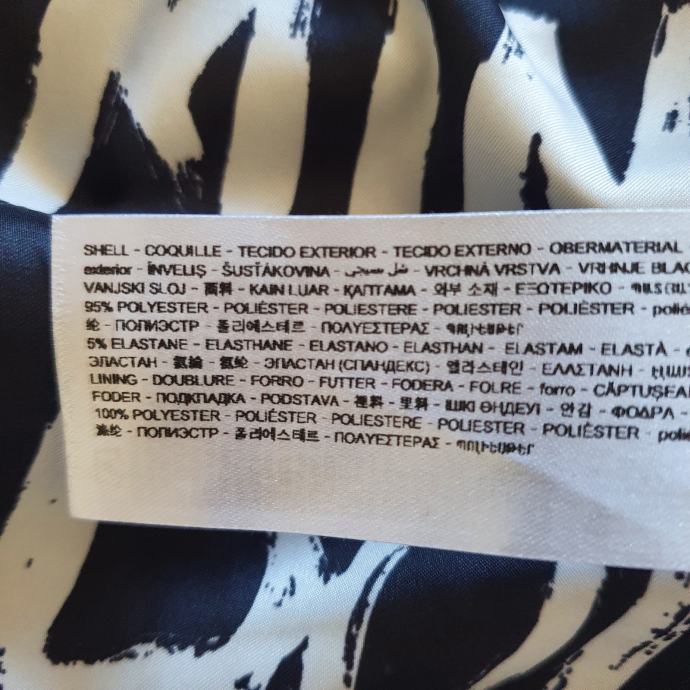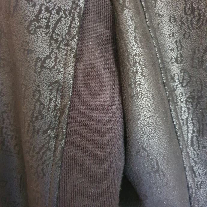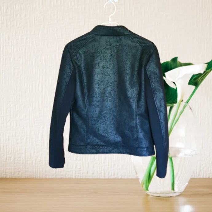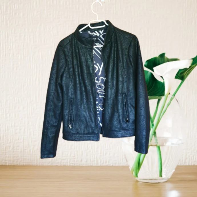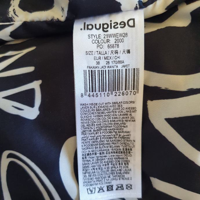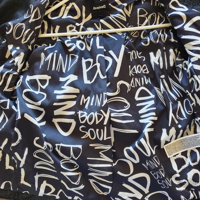 Crna Desigual jakna modernog, ženstvenog kroja s diskretnim sjajnim uzorkom po površini. Ima zatvaranje na patent, dva džepa sa strane i elastične umetke na rukavima koji omogućuju udobno pristajanje. Unutrašnjost je podstavljena upečatljivom tkaninom s bijelim natpisima “Mind, Body, Soul”.