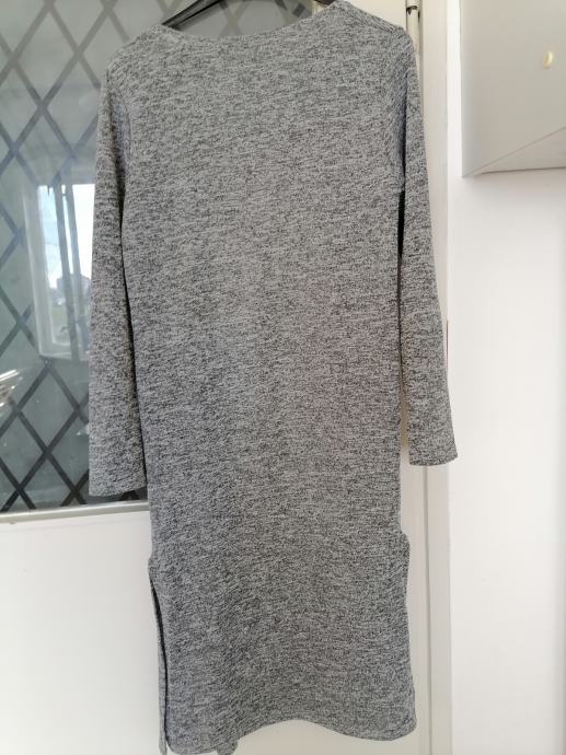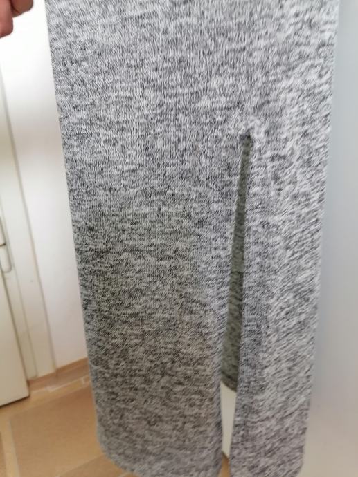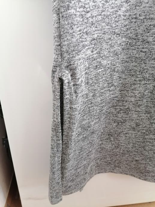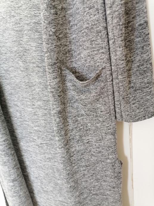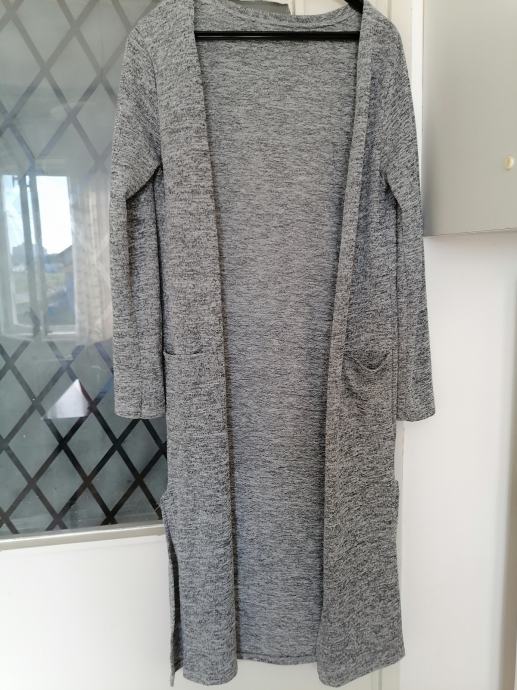 Novo, bez etikete, nikad nošen. Dugi kardigan bez kopčanja, dva džepa ima, prošarane sive boje, sa strana ima rasporke.