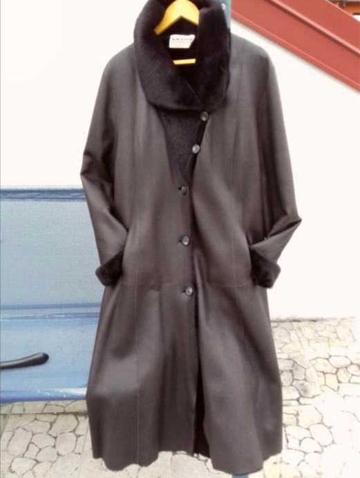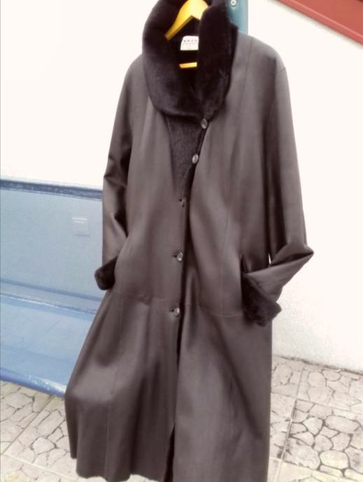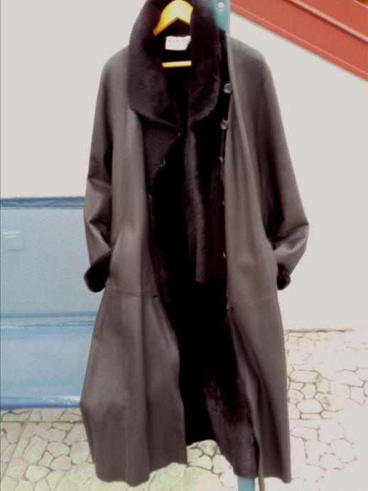 kaput je tanji, topao a lagan, izvana je koža (neke tamnije nedefinirane boje ("taupe", smeđesivo?), iznutra je cijelim putem crno krzno kratke dlake,