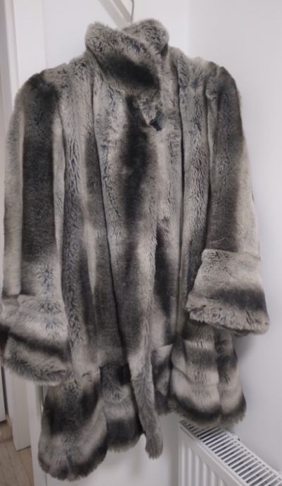 Raskosna bunda/kaput, sivo crna sa ukrasnim gumbom...ima volane na rukavima i na kraju duzine...ocuvana, kao nova, vrlo malo nosena...udobna, mekana i topla...