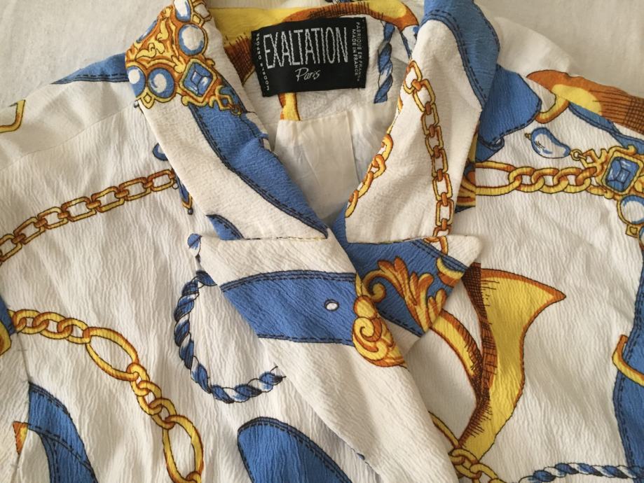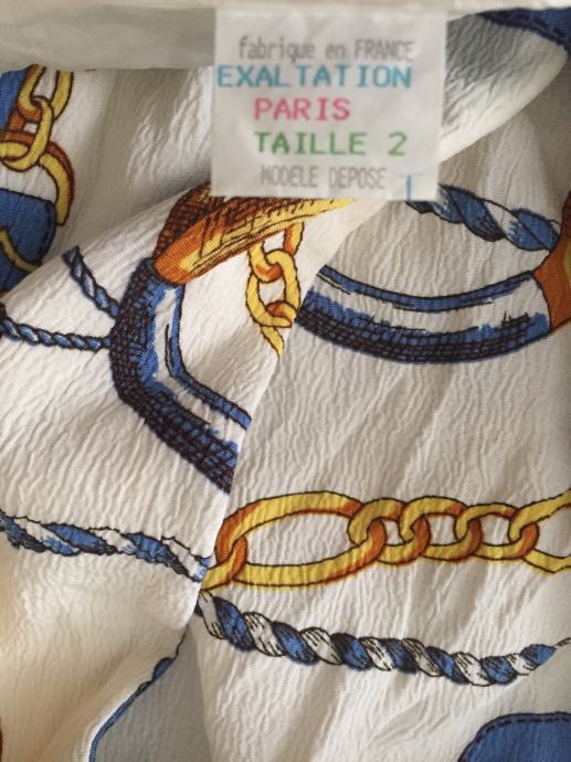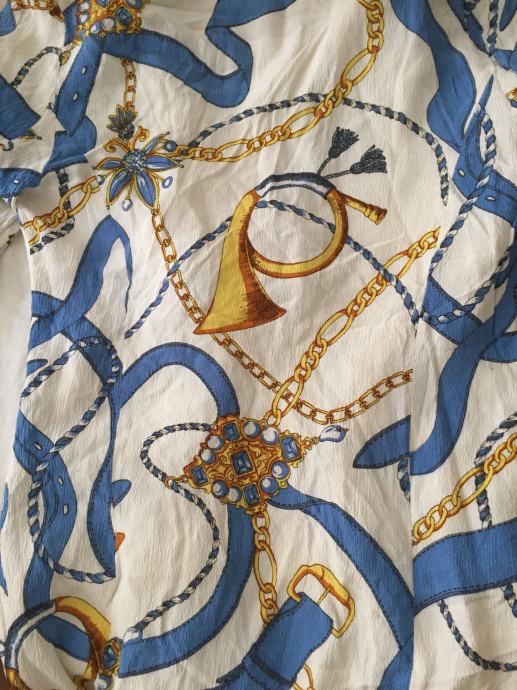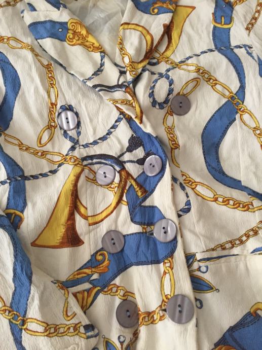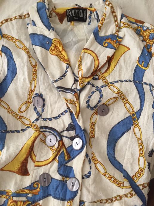 EXALTATION PARIS ...Zanimljiva ljetna jakna Versace style sa printom lanaca..viskoza 100% “zgužvanog”efektnog aspekta....made in France..dulja, na duplo kopčanje..saten podstava..vel.M/L..Fr 2..Vintage!
