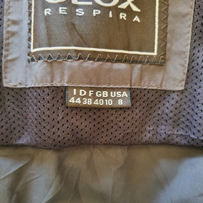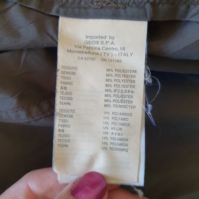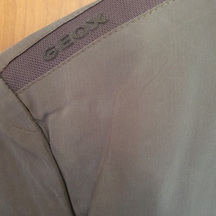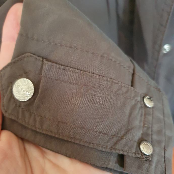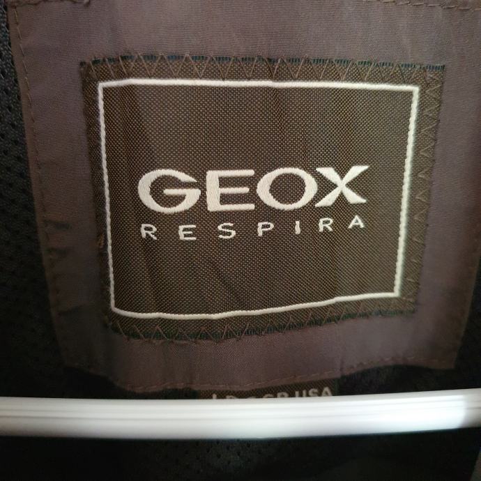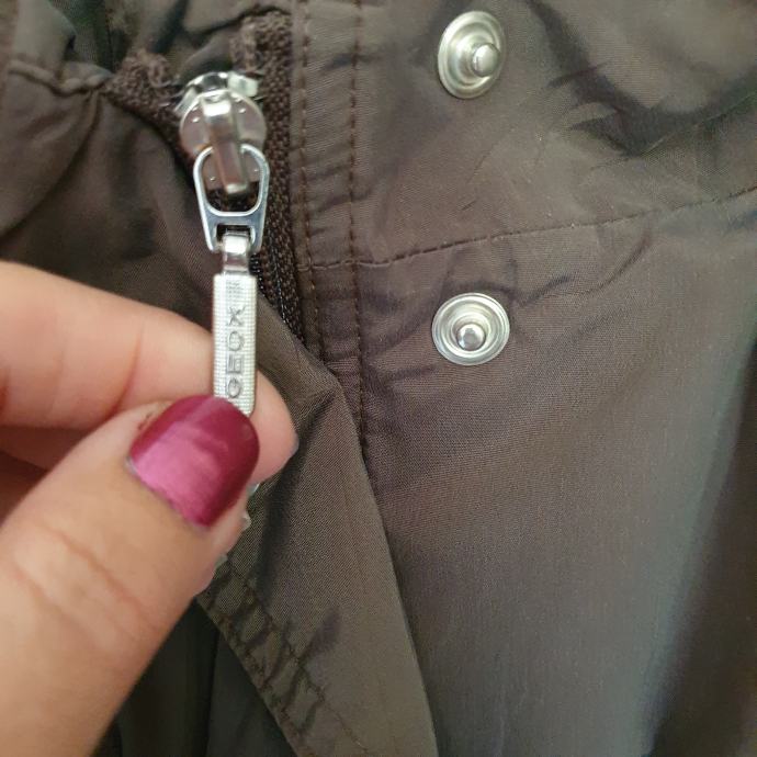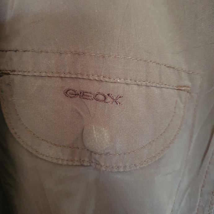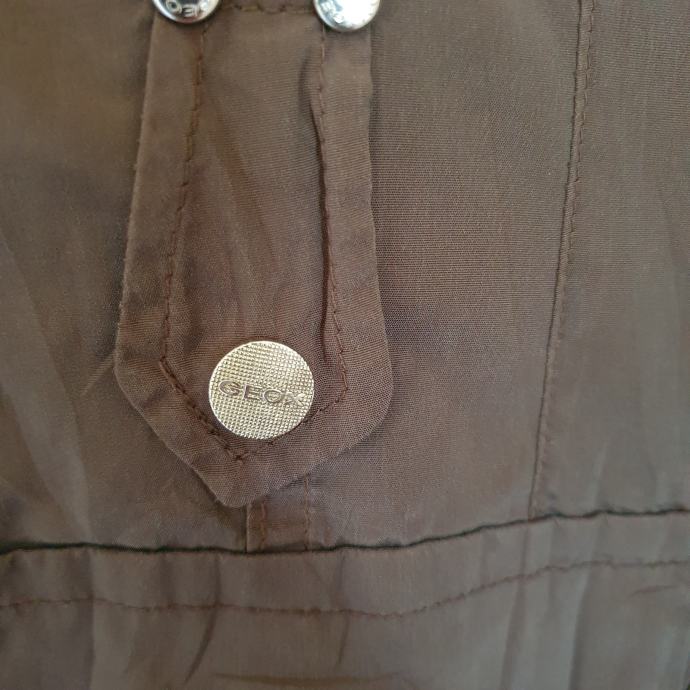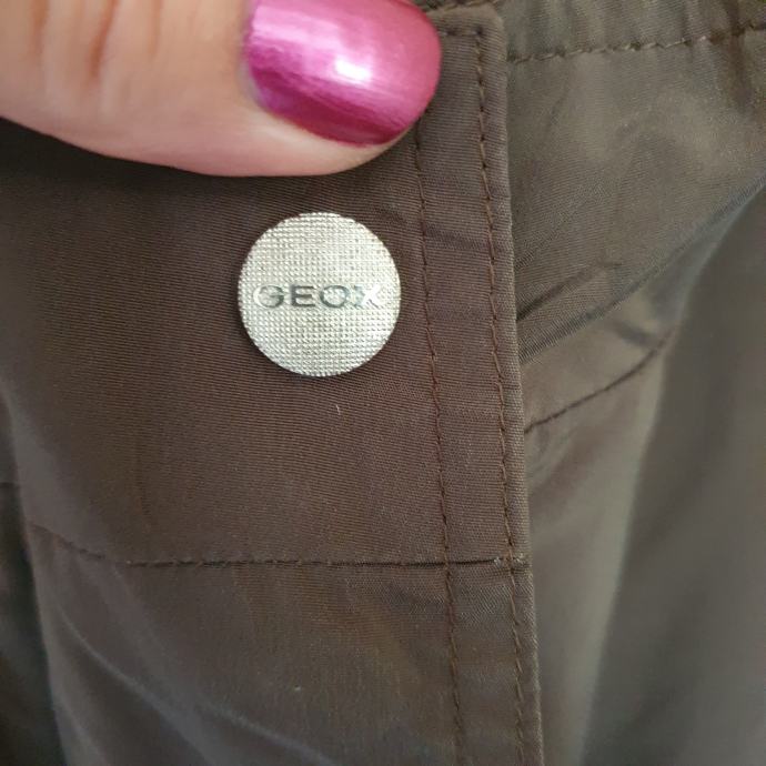 Smeđa jakna Geox respira veličina 38. Ramena 41cm, prsa 50cm, rukavi 61cm, dužina 69cm. 86% poliester, 14% poliamid.
