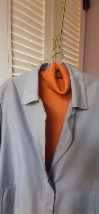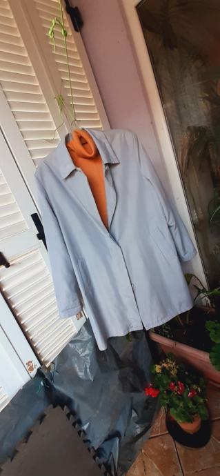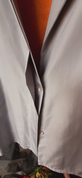 Kao novi, svjetlosivi mantil, bez greške, izuzetno lijep, ugodan, lagan i ležeran, kopčanje na skrivena dugmeta, podstavljen, sa dva ukrojena džepa. Veoma mekane je strukture, što ga čini neophodnim za jesenje ili proljetne dane. Bezvremenski klasični mantil, "A" kroja. Širina od pazuha do pazuha 72 cm, dužina od vratnog izreza iza do ruba 90 cm, dužina rukava od pazuha do ruba 42 cm, širina ramena 45 cm.