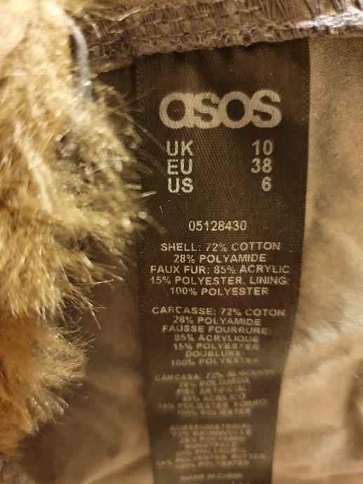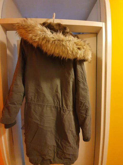 Prodajem žensku zimsku parku marke ASOS u veličini 38. Jakna je maslinasto zelene boje, izrađena od pamuka s unutarnjom postavom od umjetnog krzna koje pruža dodatnu toplinu. Na kapuljači se nalazi dekorativni obrub od umjetnog krzna. Model je duljeg kroja s mogućnošću stezanja u struku, a ima i nekoliko džepova sa strane.