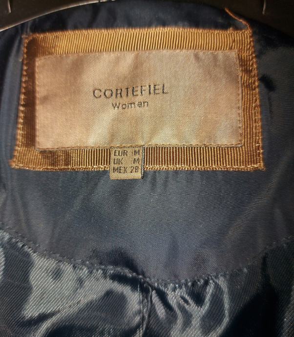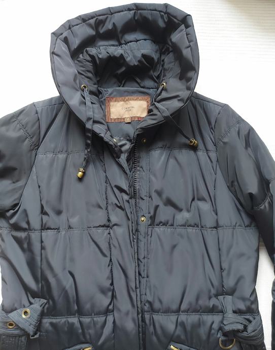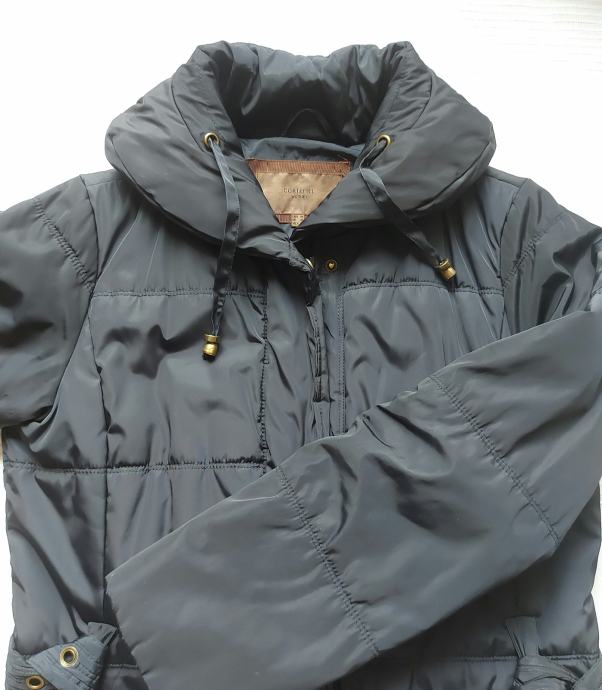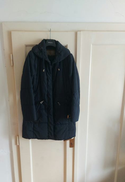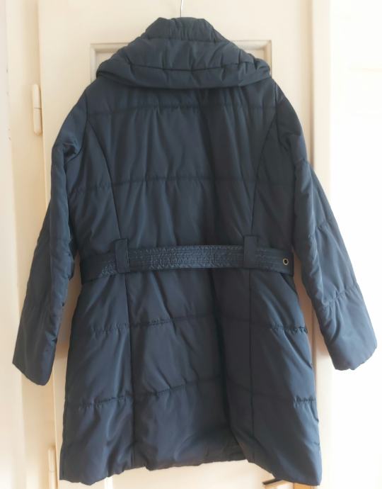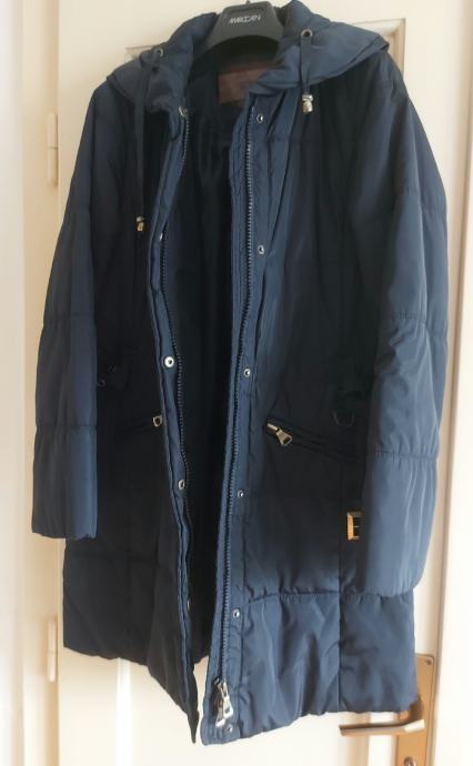 Tamno plava duža jakna-kaput.Poliester ,umjetno punjenje.Broj 38.Sakriveno kopčanje patentnim zatvaračem i drukerima.Jedan džep na futeru unutarnja strana i 2 džepa izvana.Ima remen sa kopčom.Dužina iznad koljena cca 10cm.Dužina jakne 88cm.Obujam ispod pazuha 110 cm.Ovratnik malo povišen.Nema kapuljaču.Nema oštecenja,kratko nošena.