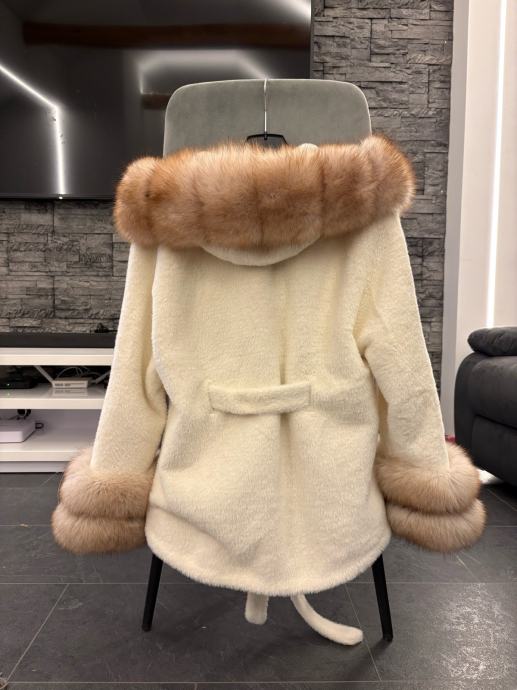 Novi bijeli kaput od alakantre raskošnim detaljima od lisičjeg krzna. Elegantan model s kapuljačom i pojasom za savršeno pristajanje. Savršena kombinacija luksuza i topline za zimske dane.