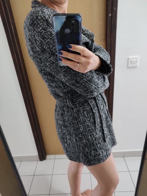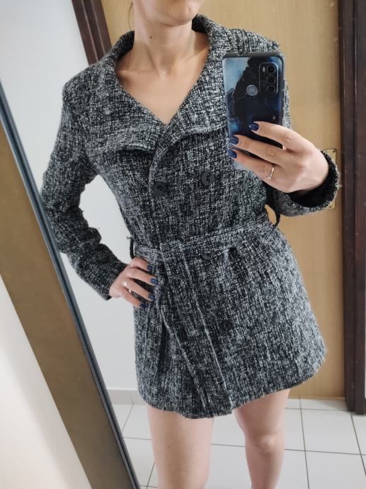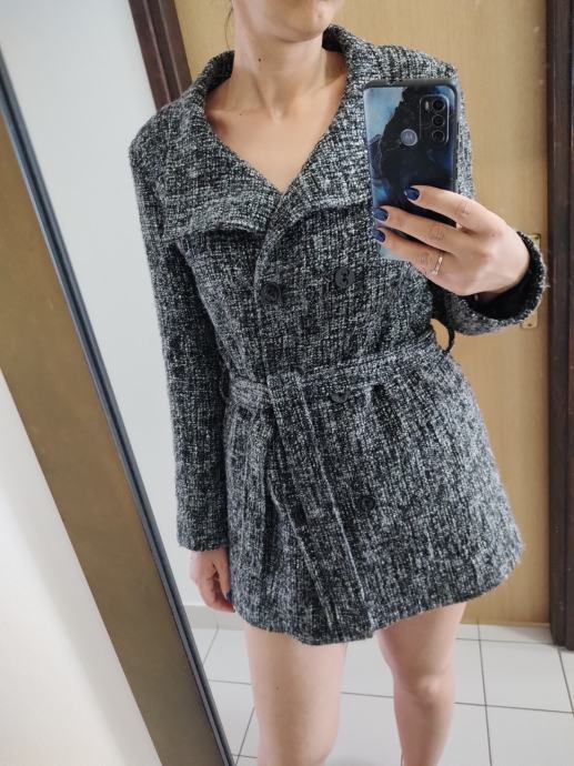 Prodajem kratki kaputić iz Modinga. Nošen je i ima malo mucica po sebi (takav je materijal), ali ne ističe se kod nošenja. Zato je niža cijena iako je skupo plaćen. Kragna se može nositi kao na prvoj slici ili podignuta. Ima dvostruki red kopčanja i pojas u struku.