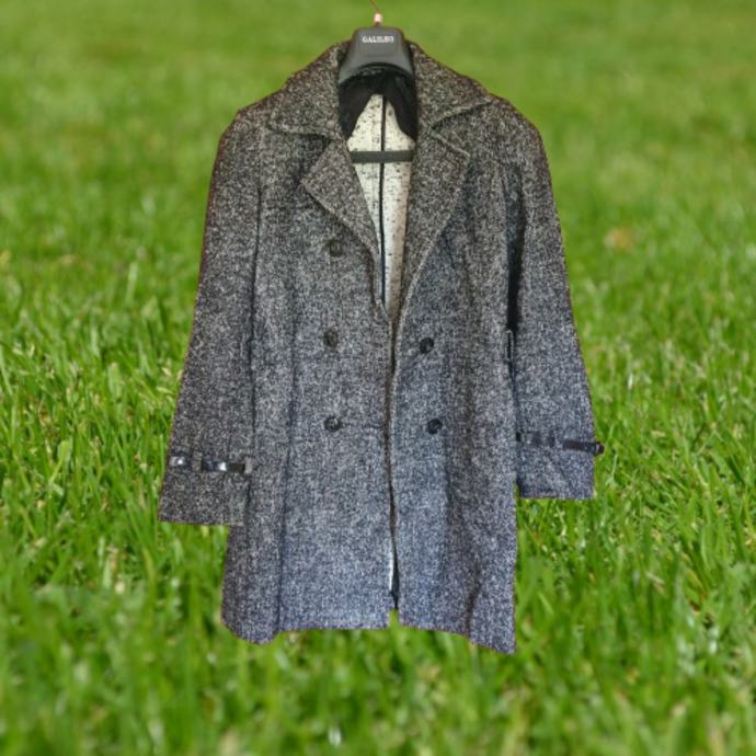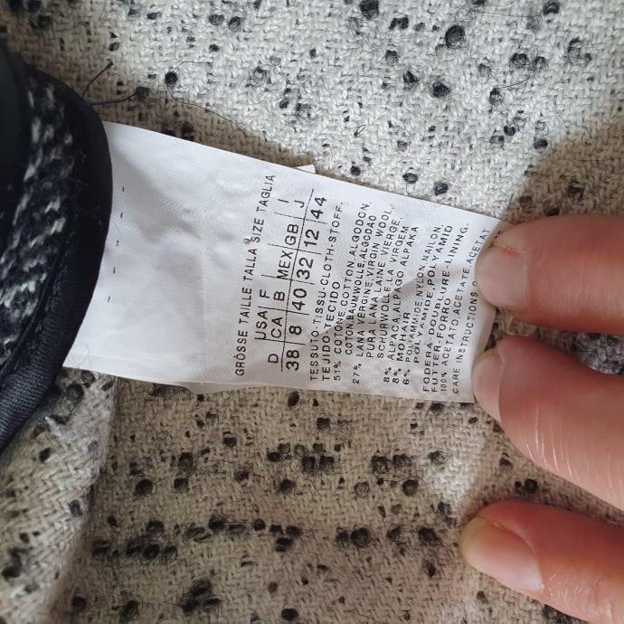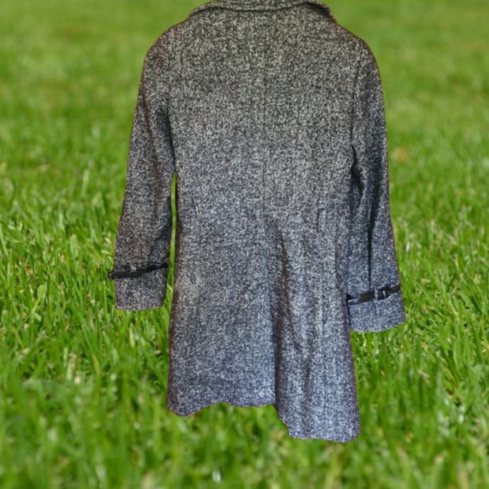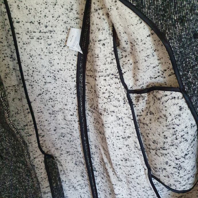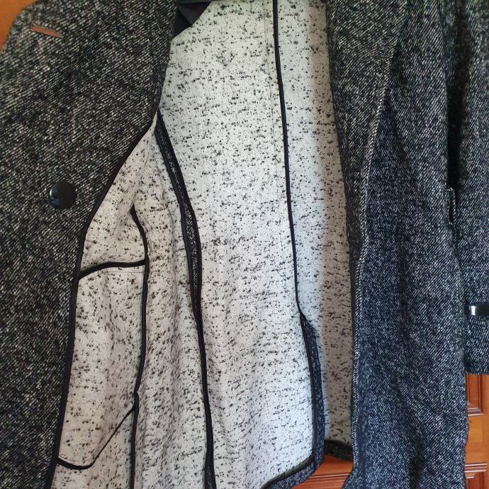Prekrasan sivi prošarani kaput Marella talijanska veličina 44 odgovara našoj 40. Idealan za prijelazna razdoblja. Jedino mi fali remen ostalo je sve super. Mjere su ramena 41 cm, prsa 51 cm, rukavi 66 cm, dužina 95 cm. Sastav je 51 % pamuk, 27 % lan, 8 % alpaka, 8 % mohair, 6 % poliamid. Materijal je baš kvalitetan i mekan.
