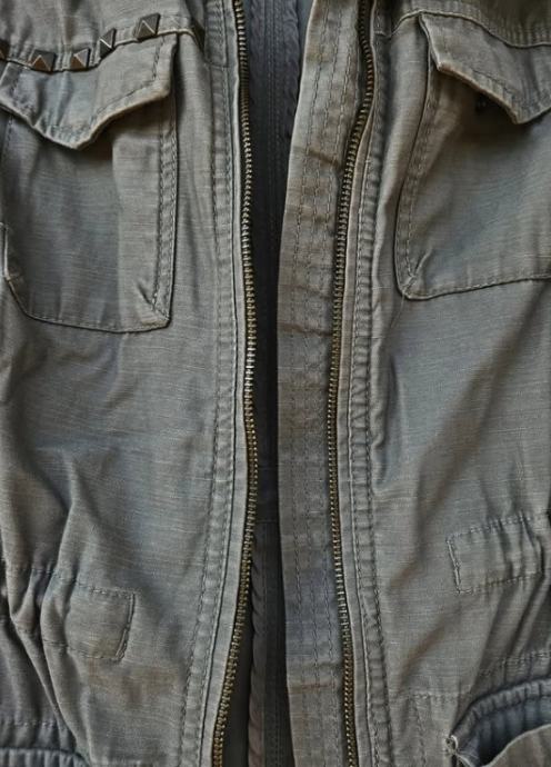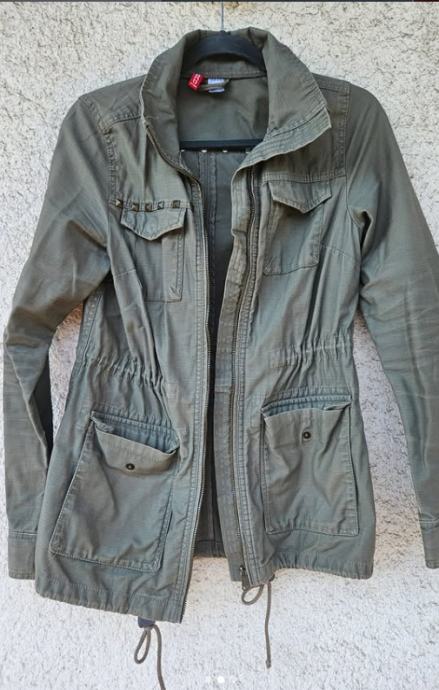 Maslinasto zelena lagana parka jakna s vezanjem u struku i donjem rubu. Ima četiri džepa sprijeda i zanimljive detalje s metalnim zakovicama na prsima. Idealna za prijelazne periode.