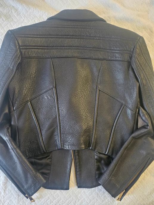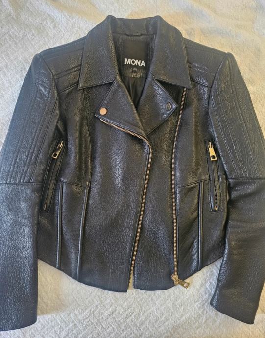 MONA kožna jakna, strukirani biker model (iza kraća, naprijed duža). Slim fit. Dimenzije: širina ramena 44cm, od ispod pazuha 46cm, dužina 56 cm.