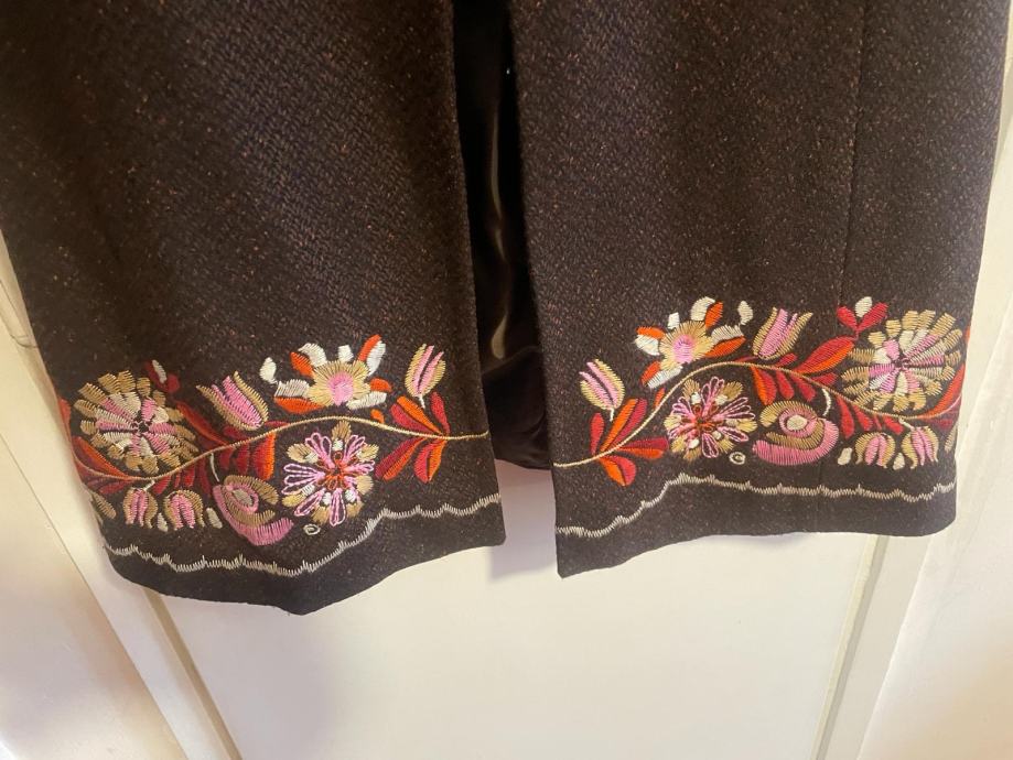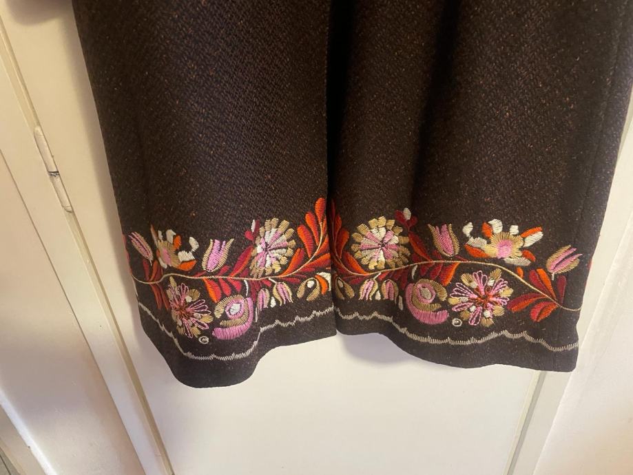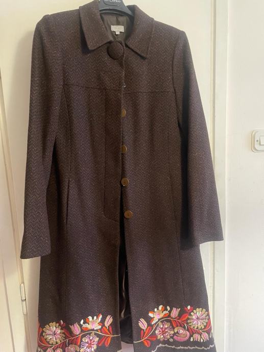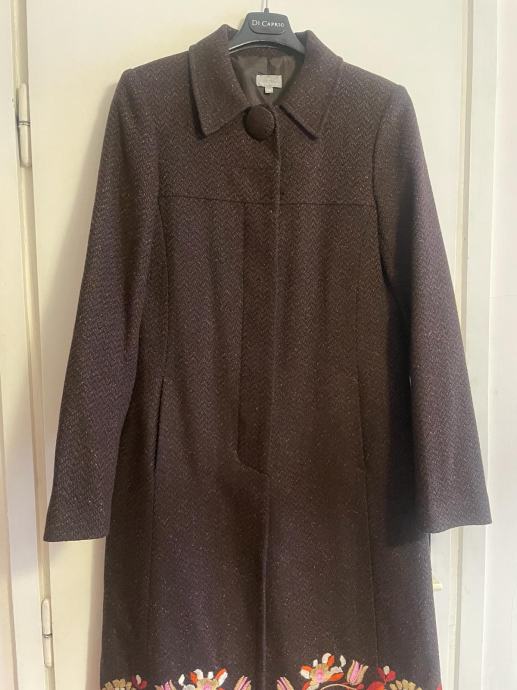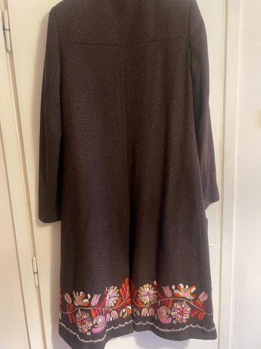 Zenski kaput marke Naf Naf, velicine 38, tamno smedje boje, malo nosen sa raznobojnim cvjetovima na donjem