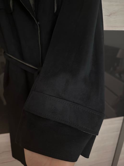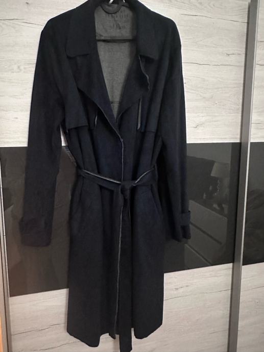 Prodajem navedeni tanji kaput, deklarirana velicina 46, no ima pasicu oko struka tako da savrseno odgovara i manjim velicinama. Podstava je od sivog pamuka, dok je gornji dio od tzv brušene kože u tamno plavoj boji.