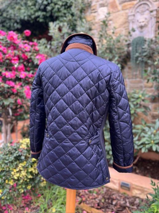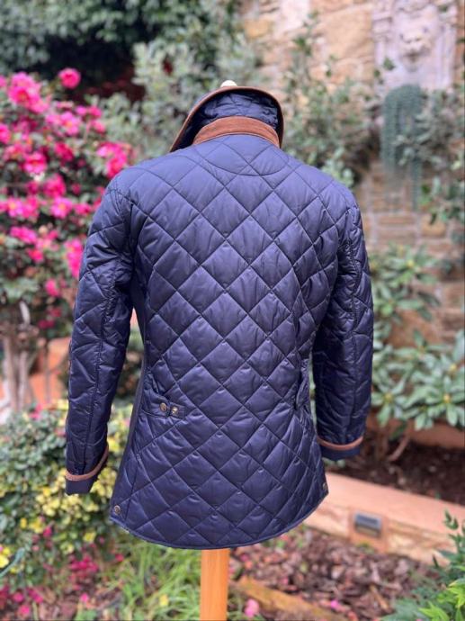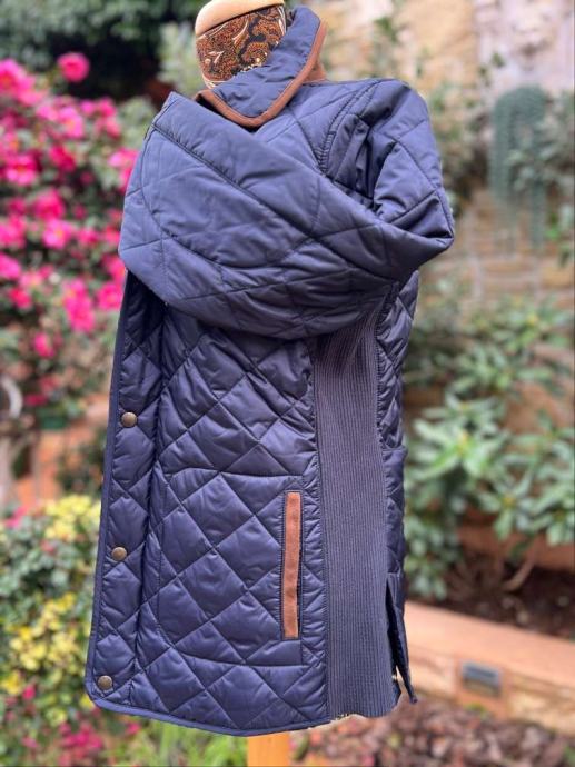 Ova jakna izrađena je od prošivenog, tamnoplavog poliestera s dijamantnim uzorkom.