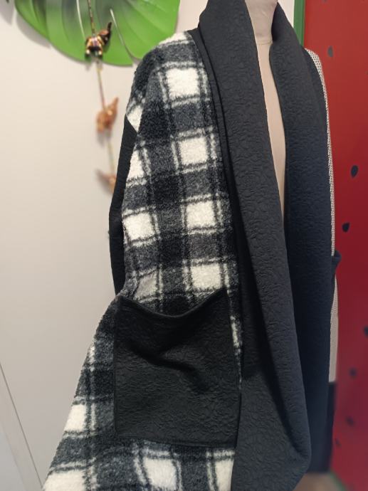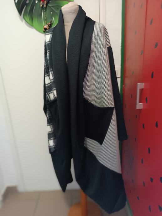 Predivan, bogat, neopisivo lijep predimenzioniran kaput. Nov s etiketom. Uzorak kariranog i riblje kosti u crnoj i bijeloj boji.. Rađen od vune, akrila i poliestera. Na prednjem dijelu dva džepa. Zanimljiv kroj.