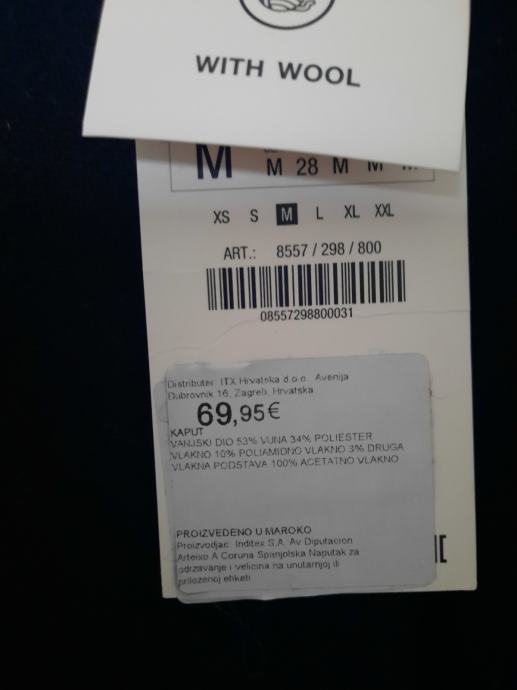 Zara prekrasni kaputić s ukrasnom dugmadi novo s etiketom, 53% vuna, 82cm dužina