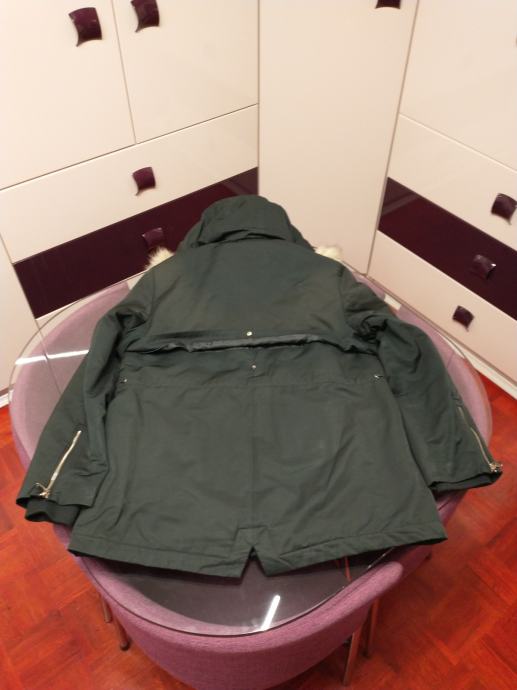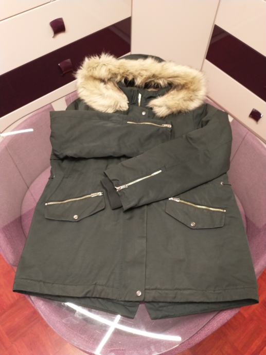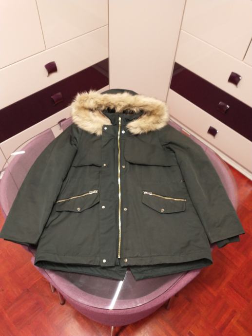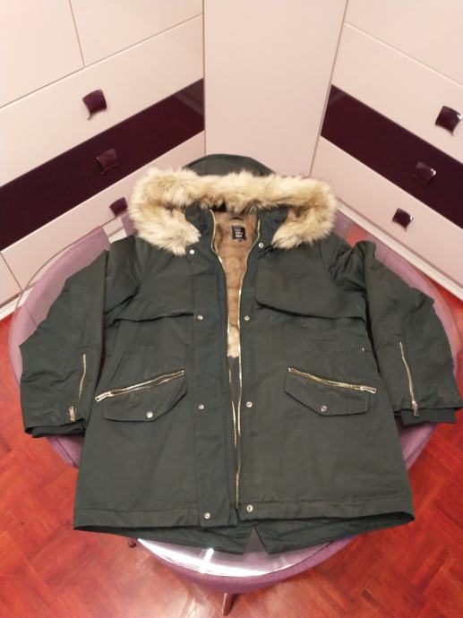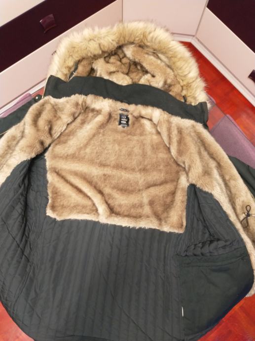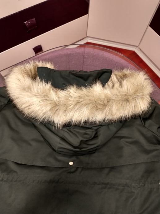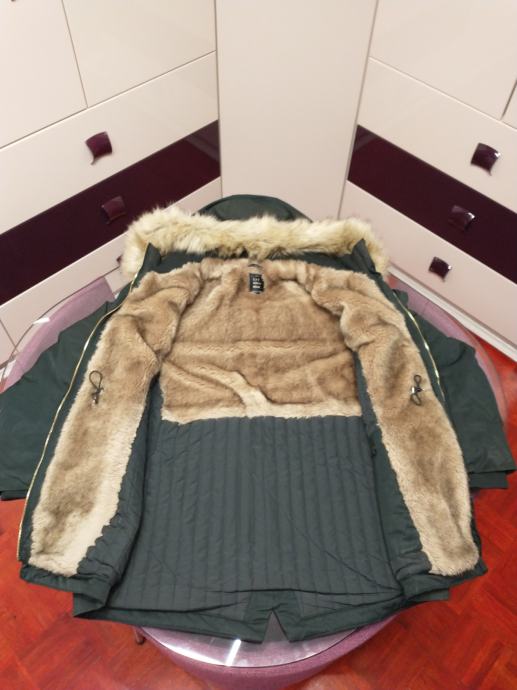 Prodajem žensku zelenu zimsku jaknu Zara veličine XL. Jakna je postavljena s umjetnim krznom i punjena. Ima kapuljaču koja je također postavljena s umjetnim krznom te ukrašena na obrubu istim.