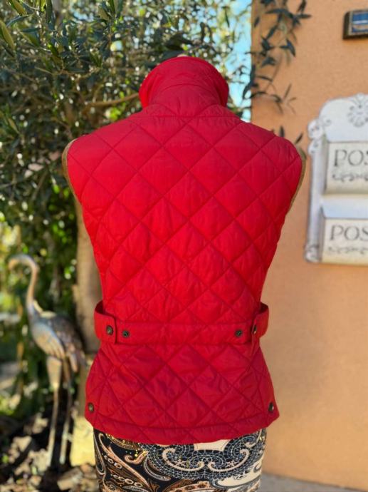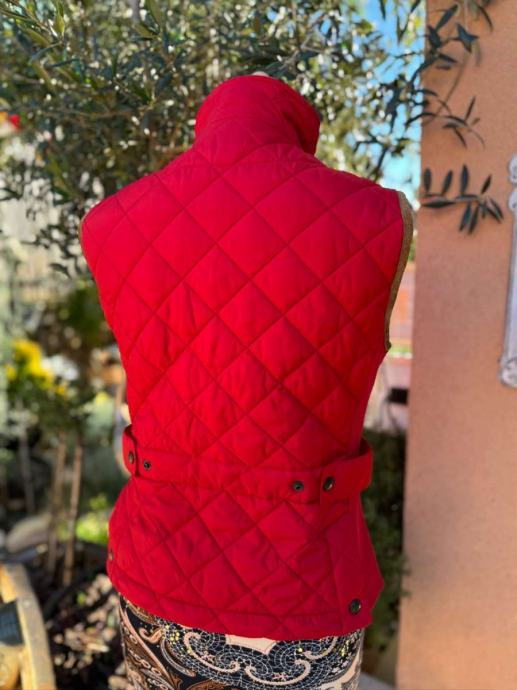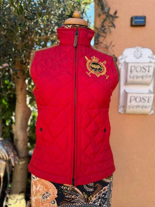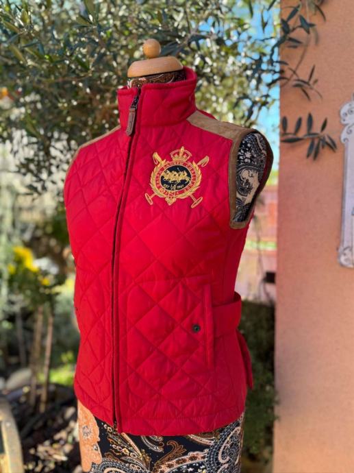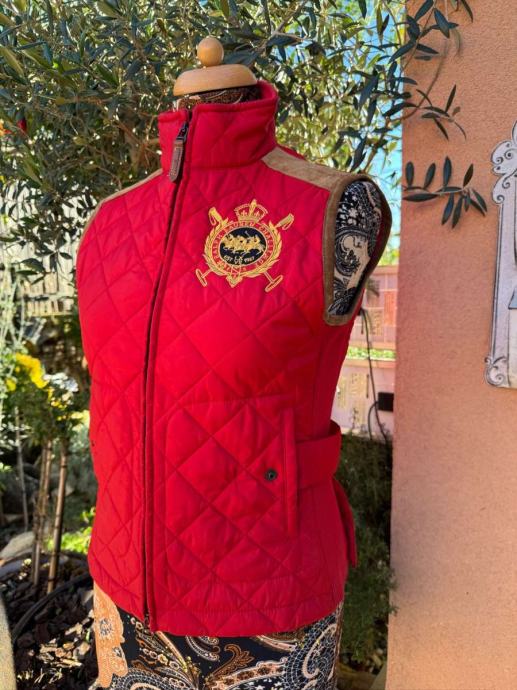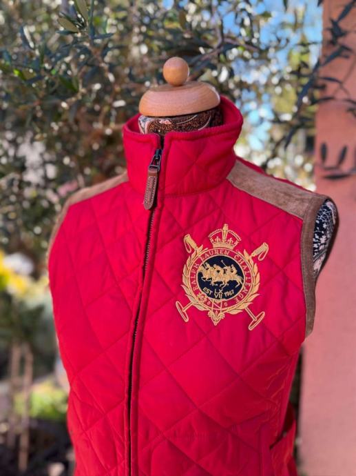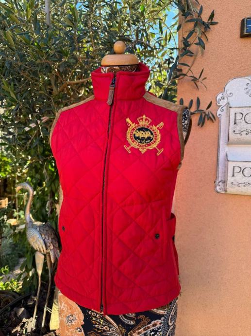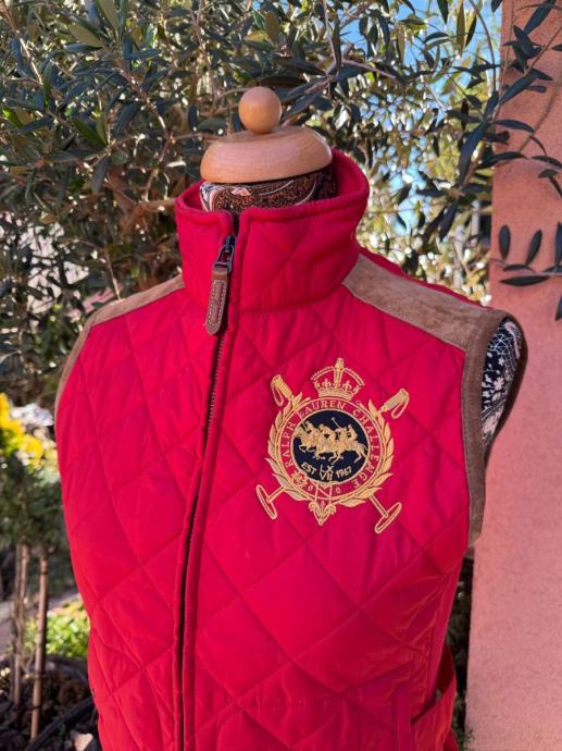 Crveni prošiveni prsluk marke Polo Ralph Lauren s obrubom od prave brušene kože na ramenima i izvezenim amblemom konjanika. Ovaj model dio je linije Ralph Lauren Sport.