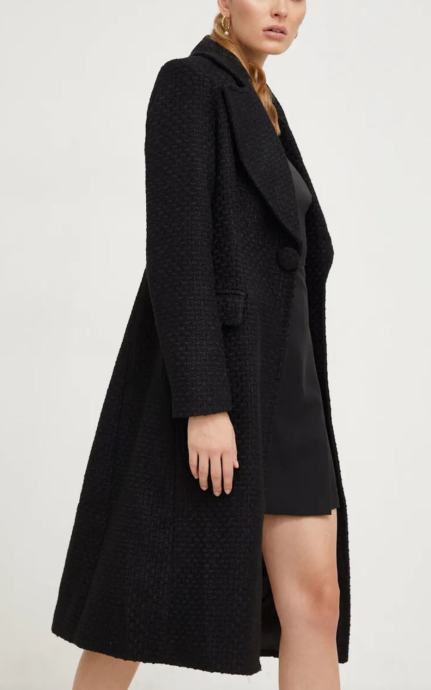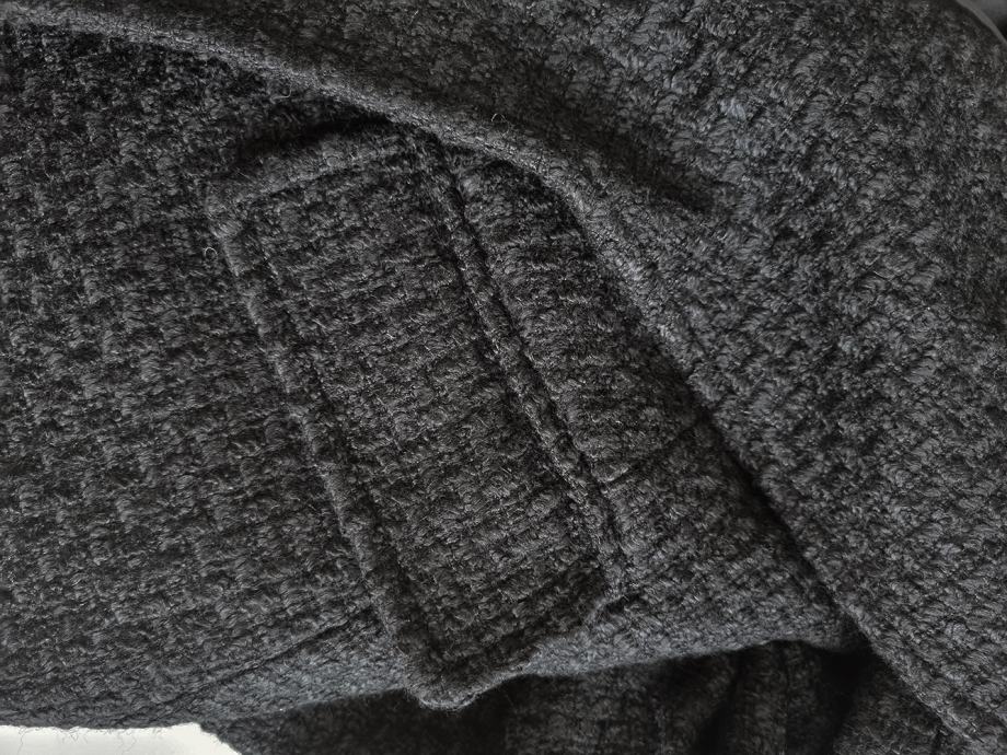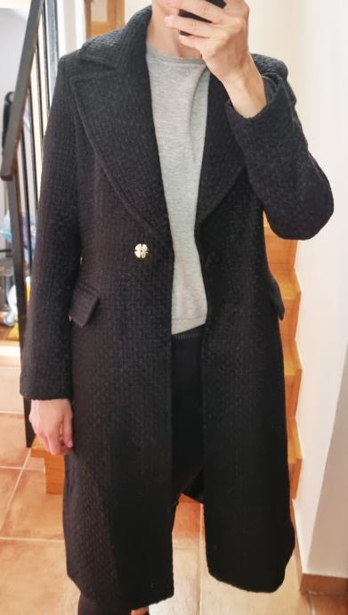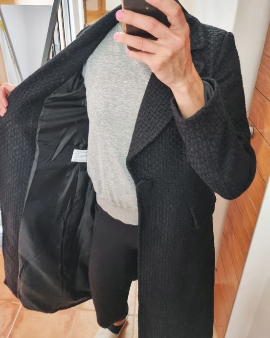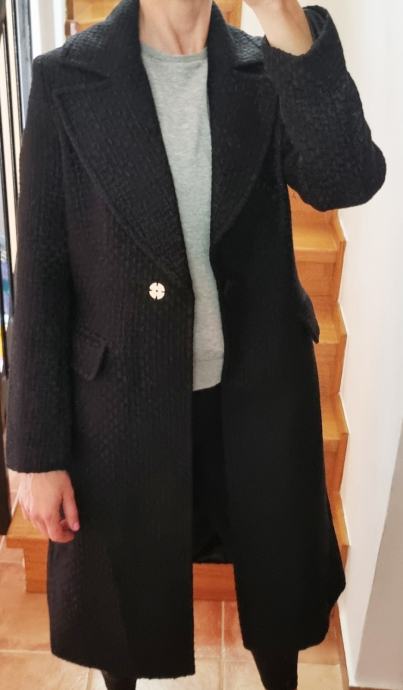 Novi, nikad nošeni strukirani kaput u crnoj boji. Materijal je teksturiran, kombinacija vune i poliestera, ušivena podstava, naprijed kopčanje na druker, sa svake strane preklopi i u ramenima ušiveni jastučići. Vrlo kvalitetnog materijala i izrade. Veličina S (duljina rukava 62 cm, duljina 103 cm, širina ispod pazuha 45 cm, širina u ramenima 33 cm) | POGLEDAJTE I OSTALE ARTIKLE NA PROFILU. PRAZNIM ORMARE. SNIŽENE CIJENE I DOGOVORI OKO CIJENE | ***POŠTARINA GRATIS***
