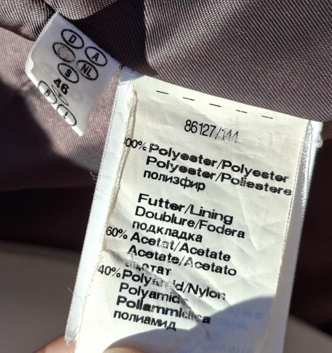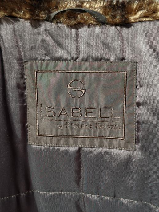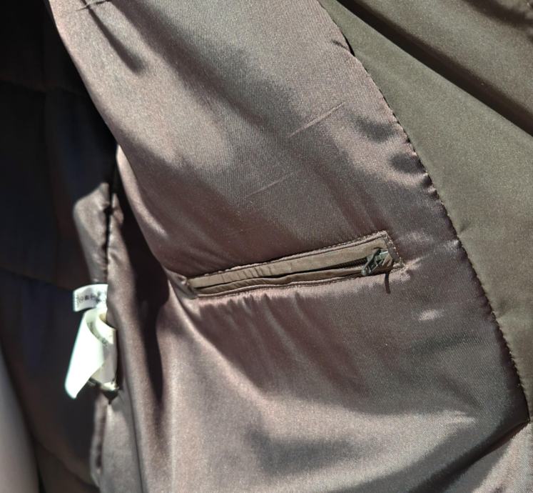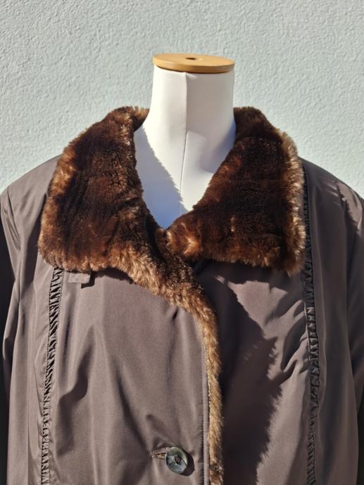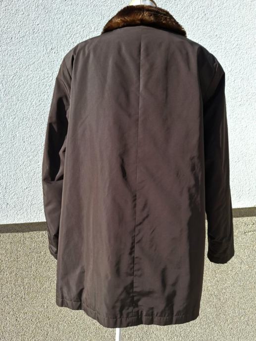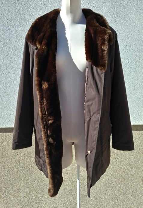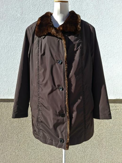 Smeđa jakna broj 44/46. Dužina 80 cm, od pazuha do pazuha 60 cm, okovratnik pravo krzno, očuvana maksimalno, kopčanje na gumbe, dva bočna džepa.