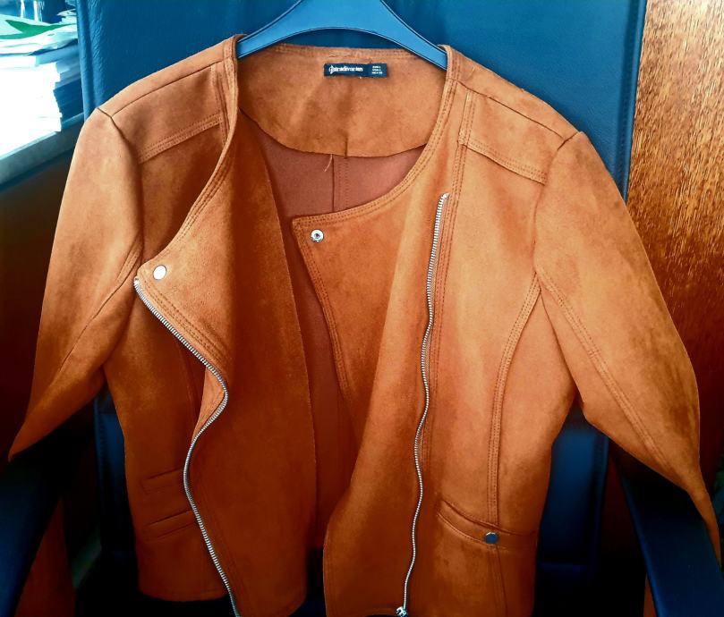Odlična smeđa, kraća jakna, boja kao tamniji camel, bez greške.
