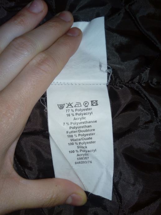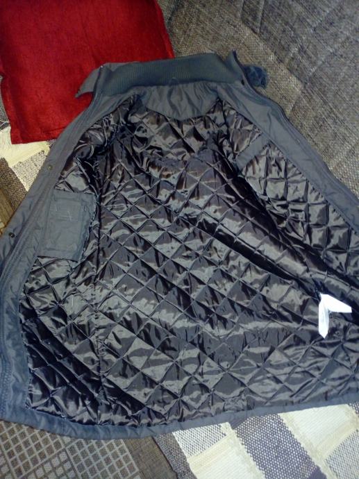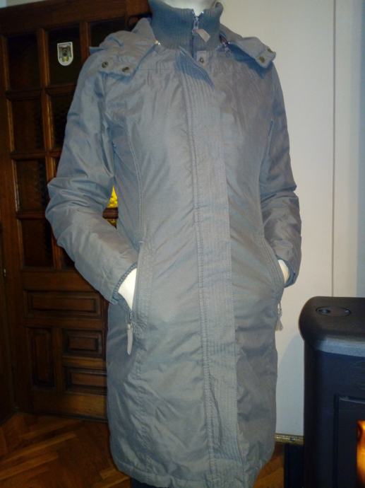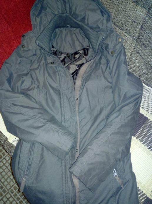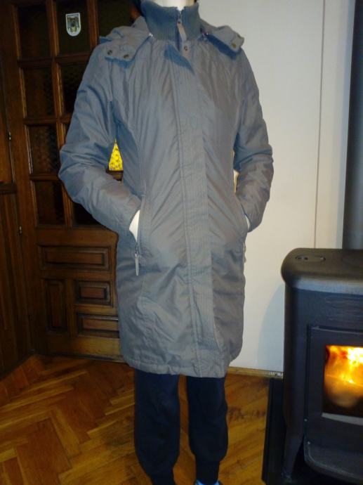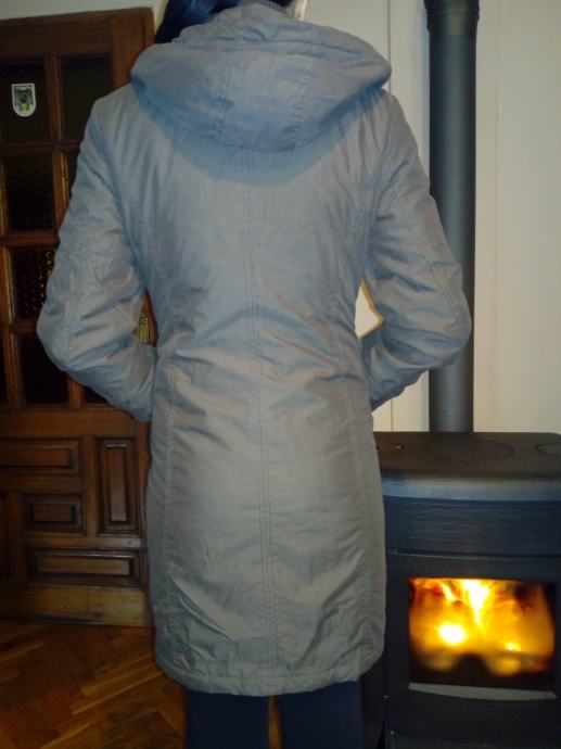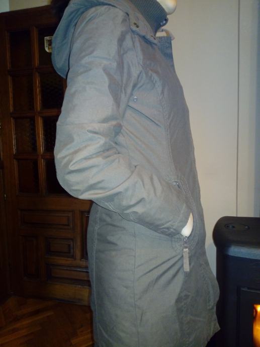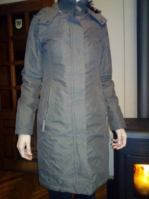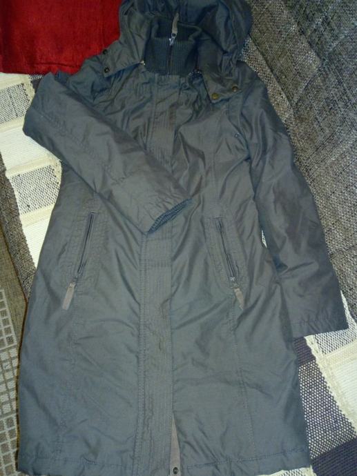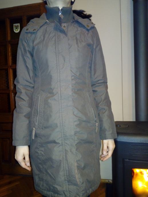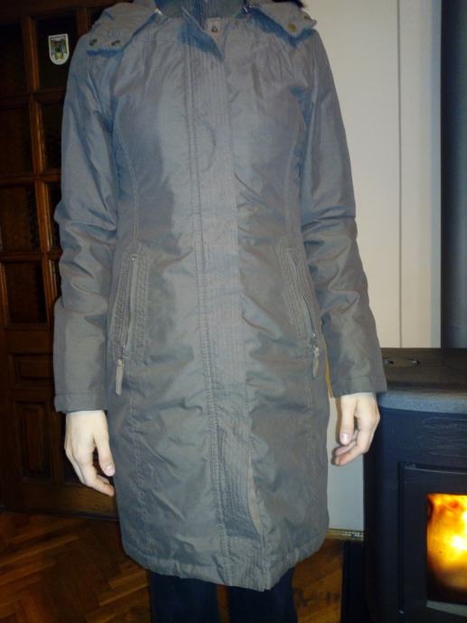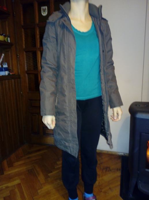 Tamno smeđa jakna, velicina 36, do koljena, prati liniju tijela, topla jer je postavljena, na fotkama se ne vidi bas dobro boja, nosena par puta, potupuno ocuvana, izduzi figuru.