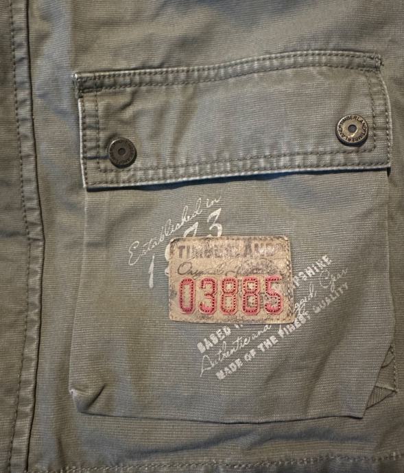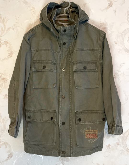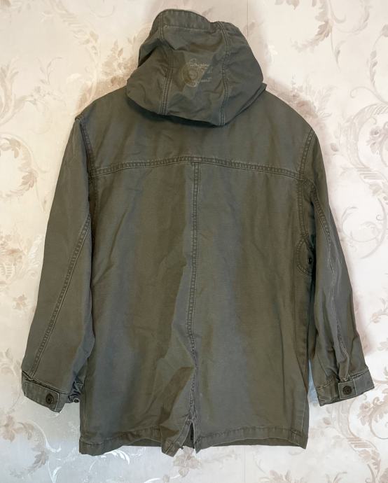 Maslinasta jakna s cargo džepovima, našivcima (aplikacijama), ušivenom kapuljačom i 4/5 rukavima.