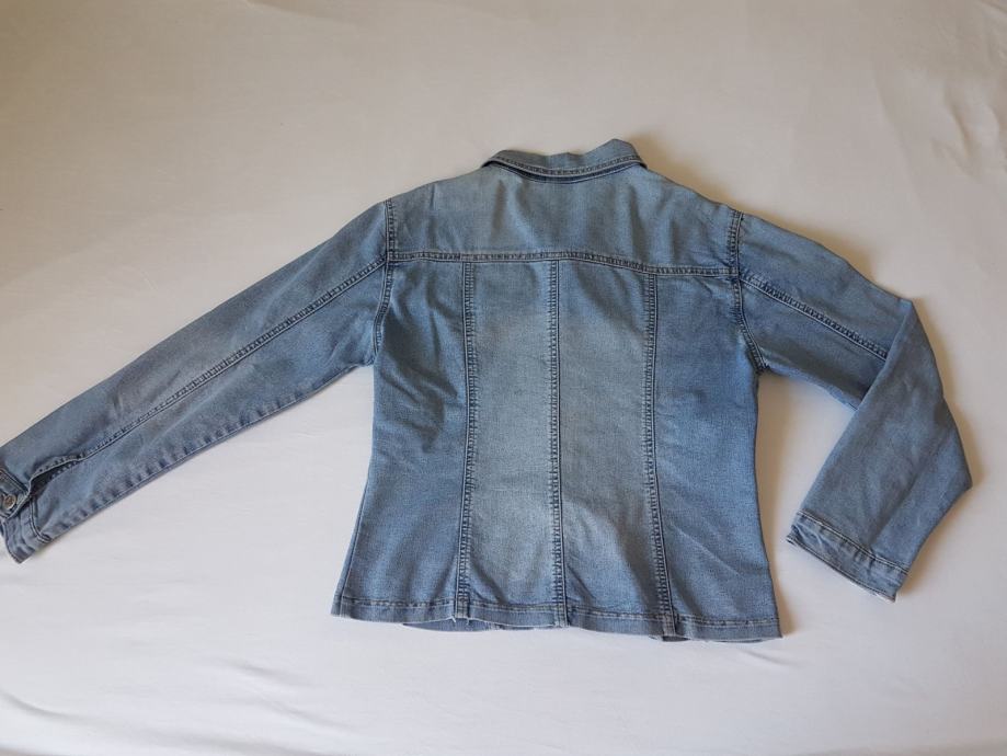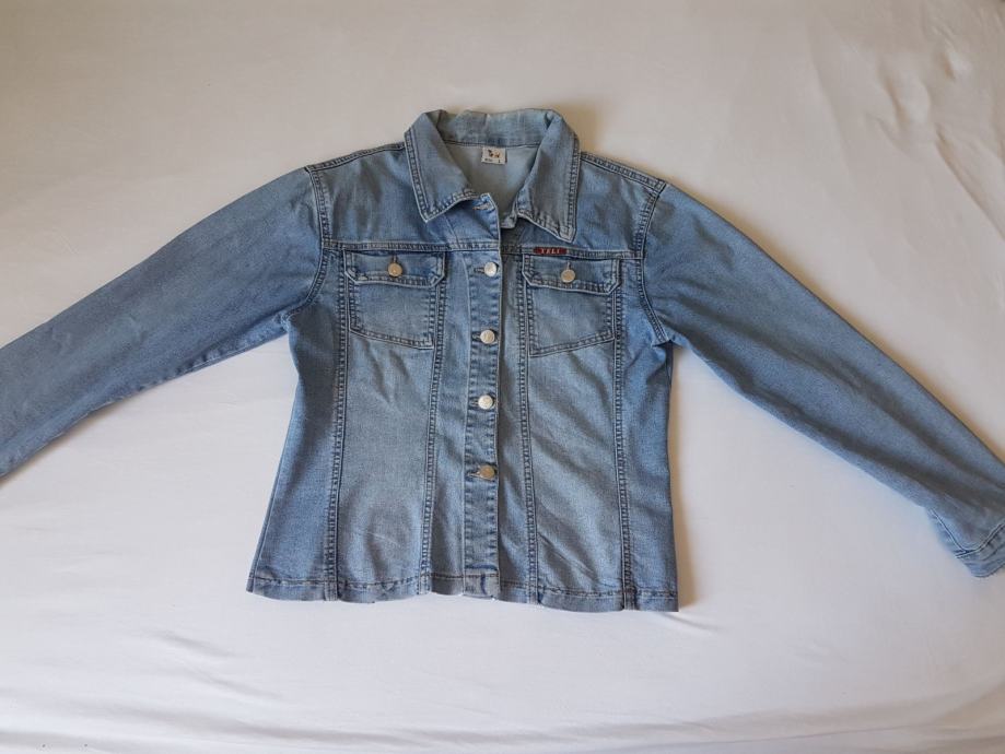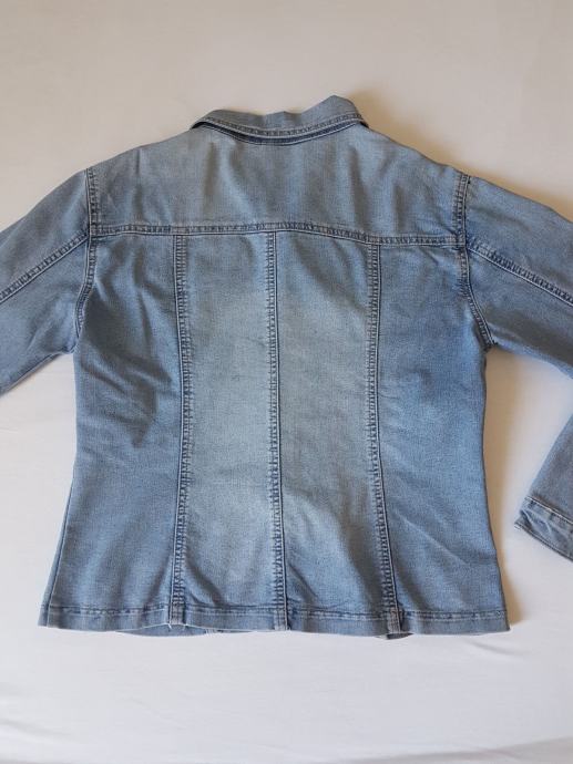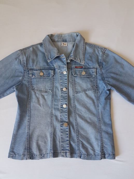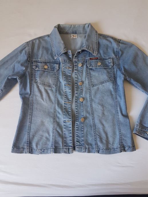 Teksas jakna svijetloplave boje, pamučna, ima elastina pa se rasteže. Nešto lakša (proljetno/jesenska). Veličina L (40). Nošena, očuvana.