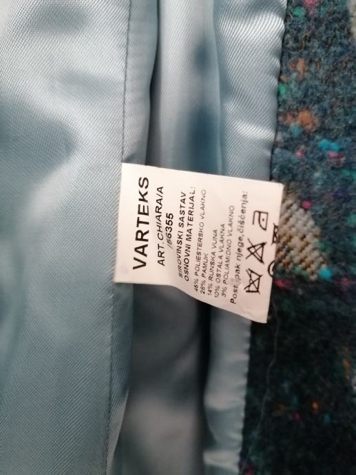 Mješavina vune, pamuka i poliestera. Deklarirana veličina je 44, ali je nešto manji, komotni 42.