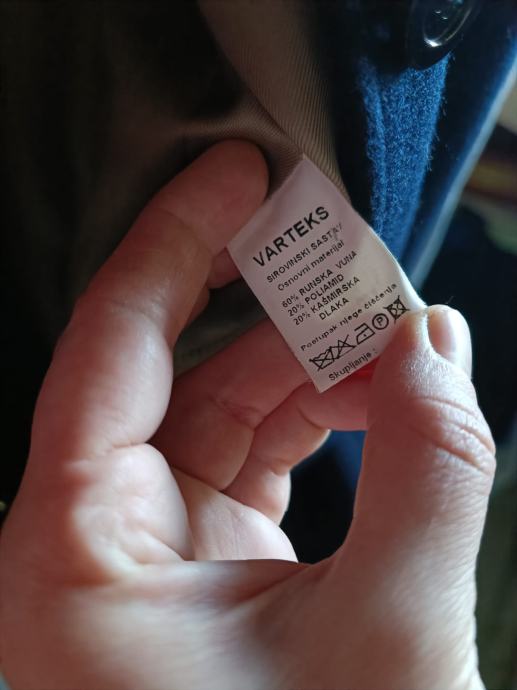 Materijal runska vuna 60%, poliamid 20%, kašmir 20%, podstava viskoza 100%.