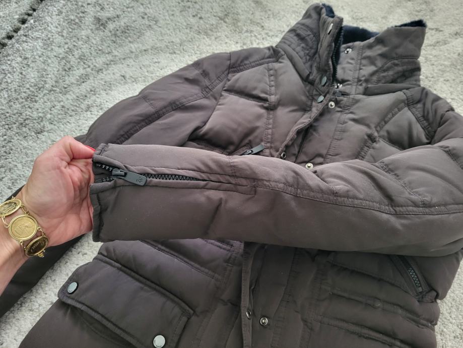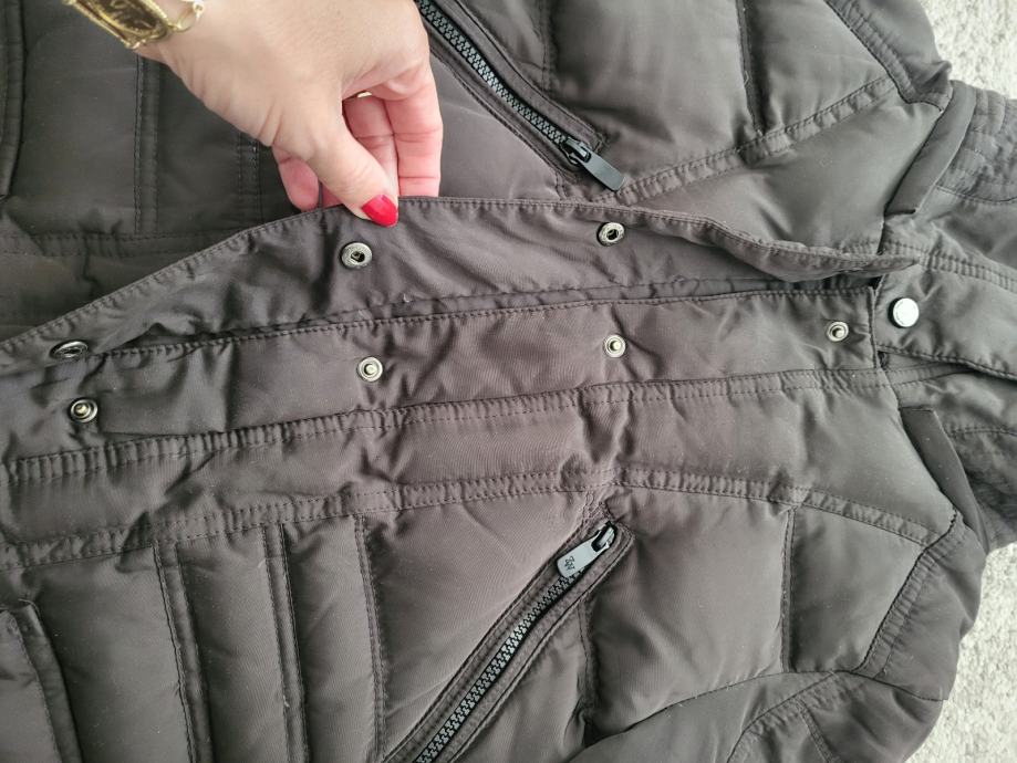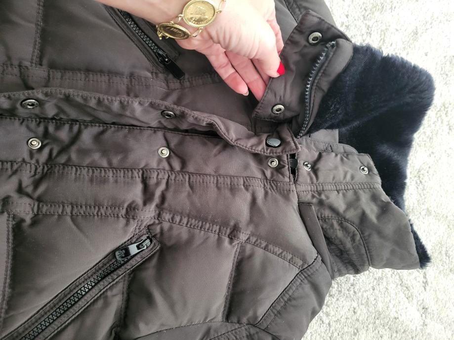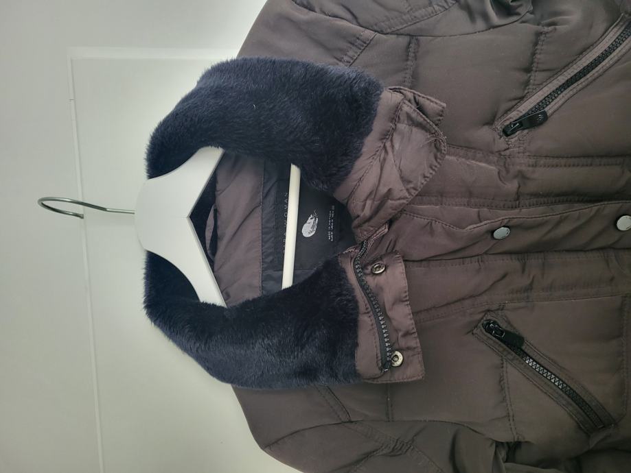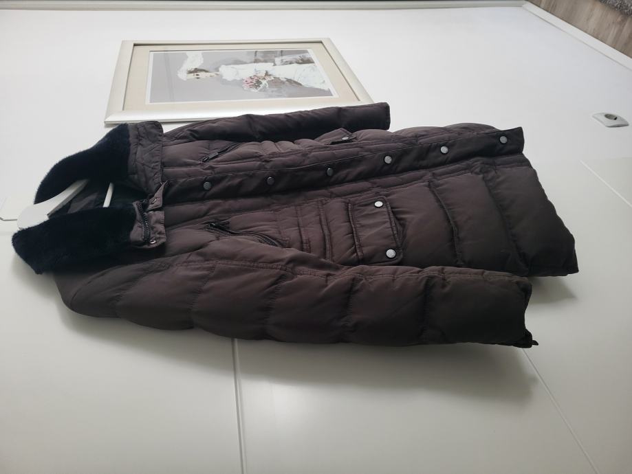 Smeđa boja, debela i topla, oprana, ima ovratnik od umjetnog krzna, punjena perjem i paperjem, naprijed ima prednje i bočne džepove, cif na rukavima, kopčanje na cif i na trukere.